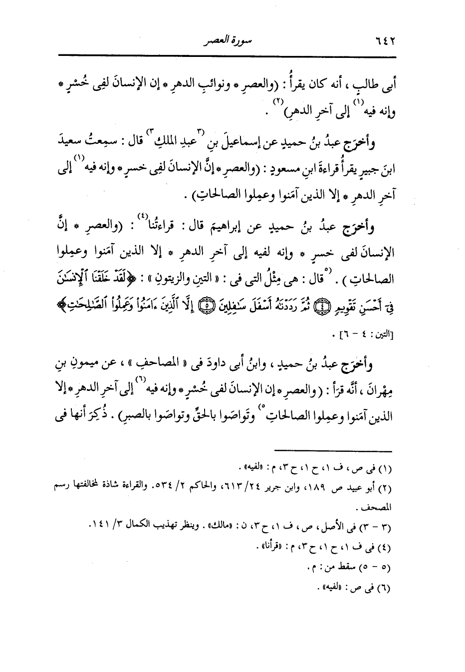 وأخرج عَبد بن حُمَيد عن حوشب قال : أرسل بشر بن مروان إلى عبد الله بن عتبة بن مسعود فقال : كيف كان ابن مسعود يقرأ {والعصر} فقال : والعصر إن الإنسان لفي خسر وهو فيه إلى آخر الدهر فقال له بشر : هو يكفر به ، فقال عبد الله لكني أومن به.