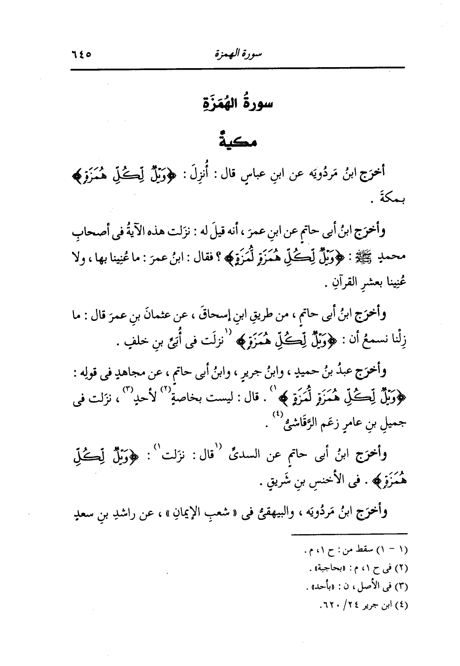وأخرج سعيد بن منصور ، وَابن أبي الدنيا في ذم الغيبة ، وَابن جَرِير ، وَابن المنذر ، وَابن أبي حاتم ، وَابن مردويه من طرق عن ابن عباس أنه سئل عن قوله : {ويل لكل همزة لمزة} قال : هو المشاء بالنميمة المفرق بين الجمع المغري بين الأخوان.