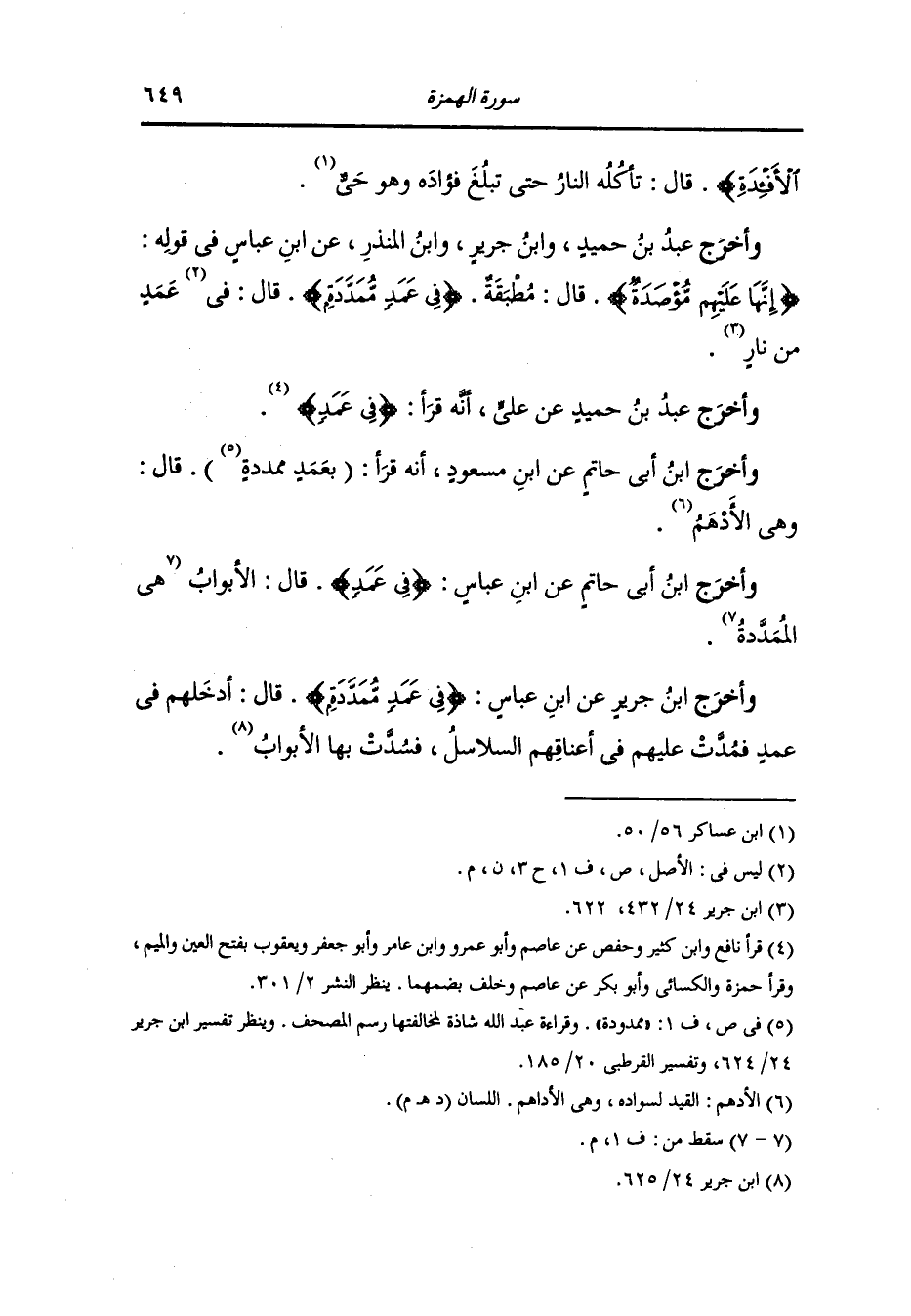 وأخرج ابن أبي حاتم عن السدي قال : من قرأها {في عمد} فهو عمد من نار ومن قرأها {في عمد} فهو حبل ممدود.
