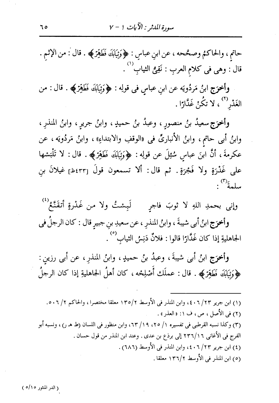 وَأخرَج ابن أبي شيبة ، وَابن المنذر عن سعيد بن جبير رضي الله عنه قال : كان الرجل في الجاهلية إذا كان غدرا قالوا : فلان دنس الثياب.