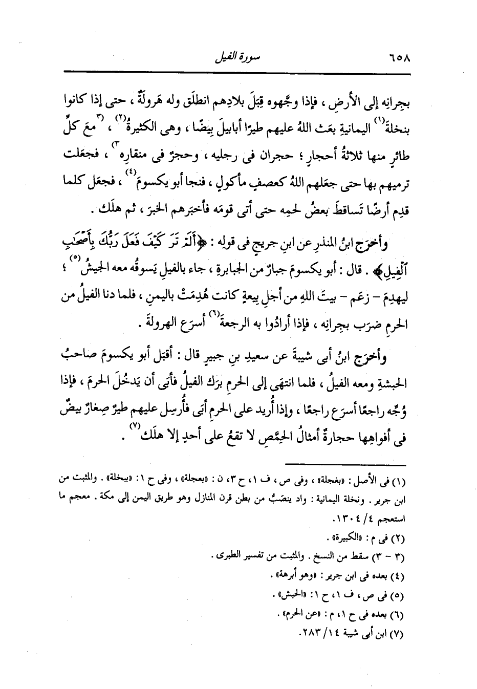 وأخرج عَبد بن حُمَيد عن ابن عباس قال : جاء أصحاب الفيل حتى نزلوا الصفاح فأتاهم عبد المطلب فقال : إن هذا بيت لم يسلط عليه أحد ، قالوا : لا نرجع حتى نهدمه وكانوا لا يقدمون فيلهم إلا تأخر فدعا الله الطير الأبابيل فأعطاها حجارة سودا عليها الطين فلما حاذت بهم صفت عليهم ثم رمتهم فما بقي منهم أحد إلا أصابته الحكة ، وكانوا لا يحك إنسان منهم جلده إلا تساقط جلده ..