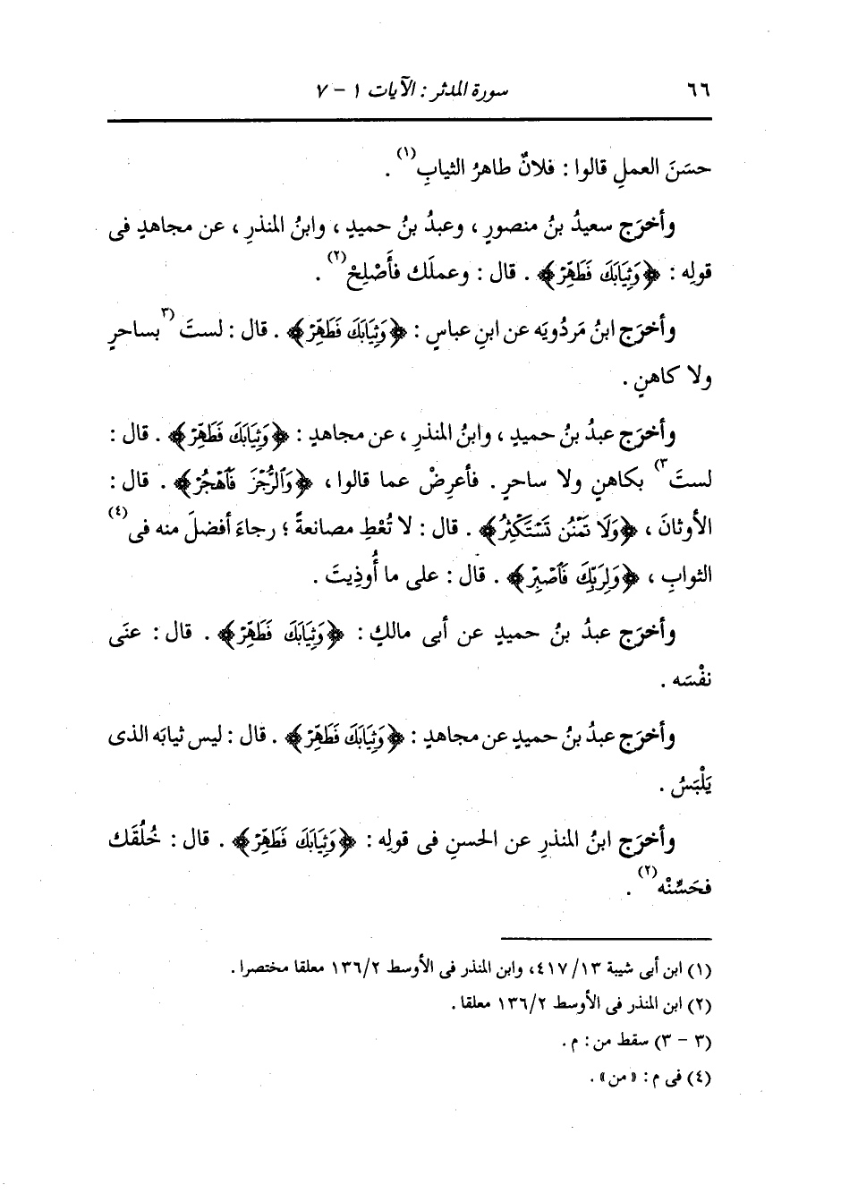 وأخرج عَبد بن حُمَيد عن أبي مالك رضي الله عنه {وثيابك فطهر} قال : عنى نفسه.