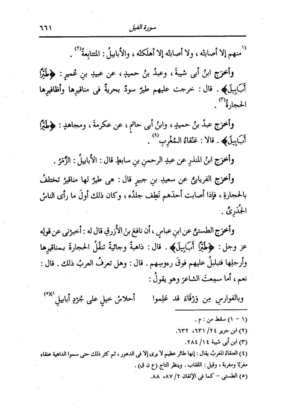 وأخرج الفريابي ، وعَبد بن حُمَيد عن ابن عباس {طيرا أبابيل} قال : فوجا بعد فوج كانت تخرج عليهم من البحر.