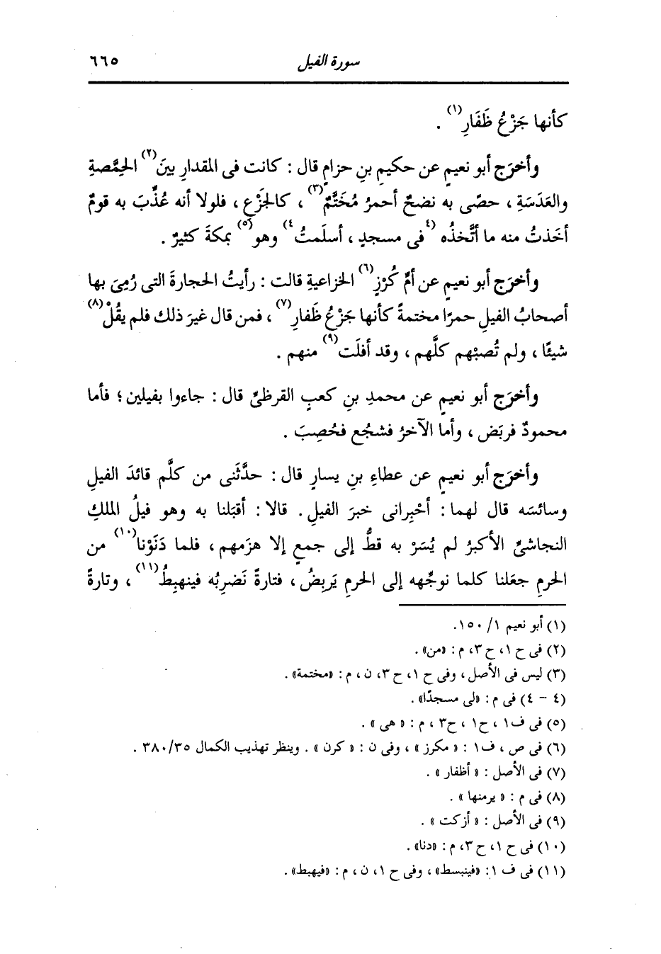 وأخرج أبو نعيم عن عثمان بن عفان أنه سأل رجلا من هذيل قال : أخبرني عن يوم الفيل فقال : بعثت يوم الفيل طليعة على فرس لي أنثى فرأيت طيرا خرجت من الحرم في كل منقار طير منها حجر وفي رجل كل طير منها حجر وهاجت ريح