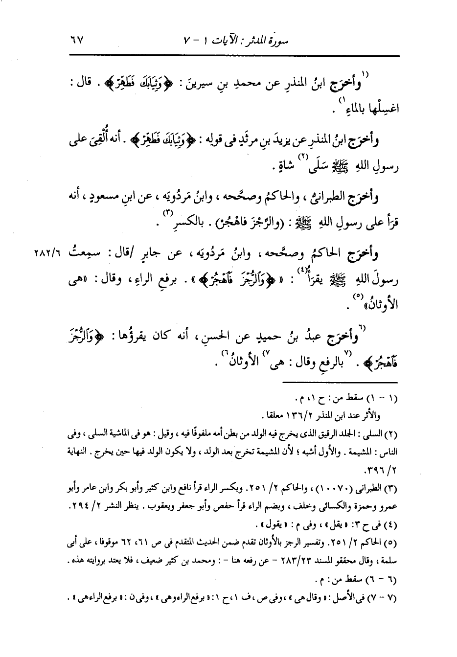 وأخرج ابن المنذر عن محمد بن سيرين : (وثيابك فطهر). قال : اغسلها بالماء ..