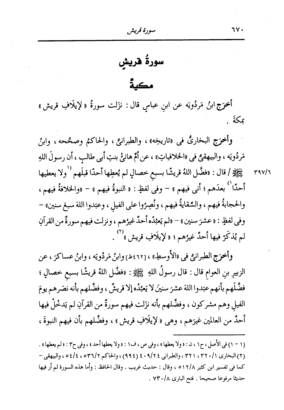 وأخرج الخطيب في تاريخه عن سعيد بن المسيب قال : قال رسول الله صلى الله عليه وسلم : إن الله فضل قريشا بسبع خصال : أنا منهم وأن الله أنزل فيهم سورة كاملة من كتابه لم يذكر فيها أحدا غيرهم وأنهم عبدوا الله عشر سنين لا يعبده أحد غيرهم وأن الله نصرهم يوم الفيل وأن الخلافة والسقاية والسدانة فيهم.