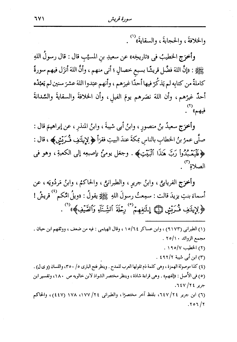 وأخرج أحمد ، وَابن أبي حاتم عن أسماء بنت يزيد قالت : سمعت رسول الله صلى الله عليه وسلم يقول : {لإيلاف قريش إيلافهم رحلة الشتاء والصيف} ويحكم يا قريش اعبدوا رب هذا البيت الذي أطعمهم من جوع وآمنهم من خوف.