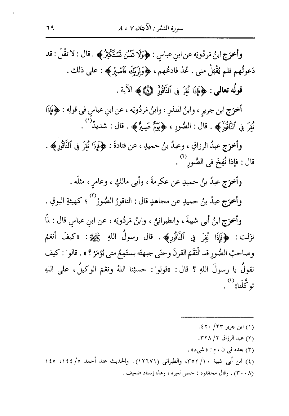 وأخرج ابن أبي شيبة والطبراني ، وَابن مردويه عن ابن عباس قال : نزلت {فإذا نقر في الناقور} قال رسول الله صلى الله عليه وسلم : كيف أنعم وصاحب الصور قد التقم القرن وحنى جبهته يستمع متى يؤمر قالوا : كيف نقول يا رسول الله قال : قولوا حسبنا الله ونعم والوكيل على الله توكلنا.