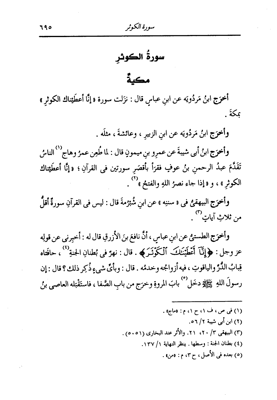 وَأخرَج ابن أبي شيبة وأحمد ومسلم وأبو داود والنسائي ، وَابن جَرِير ، وَابن المنذر ، وَابن مردويه والبيهقي في "سُنَنِه" عن أنس بن مالك قال : أغفي رسول الله صلى الله عليه وسلم إغفاءة فرفع رأسه متبسما فقال : إنه نزلت علي آنفا سورة فقرأ بسم الله الرحمن الرحيم {إنا أعطيناك الكوثر} حتى ختمها قال : هل تدرون ما الكوثر قالوا : الله ورسوله أعلم قال : هو نهر أعطانيه ربي في الجنة عليه خير كثير ترده أمتي يوم القيامة آنيته عدد الكواكب يختلج العبد منهم فأقول يا رب إنه من أمتي فيقال : إنك لا تدري ما أحدث بعدك.
