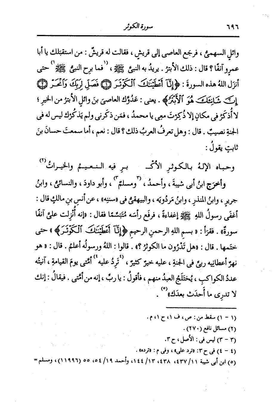 وأخرج الطبراني والحاكم وصححه ، وَابن مردويه عن أم سلمة أن النَّبِيّ صلى الله عليه وسلم قرأ هذه الآية {إنا أعطيناك الكوثر}.