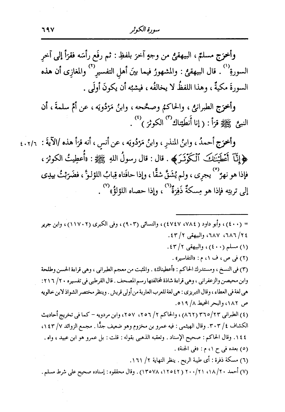 وأخرج الطيالسي ، وَابن أبي شيبة وأحمد والبخاري ومسلم والترمذي والنسائي ، وَابن ماجة عن أنس قال : قال رسول الله صلى الله عليه وسلم : دخلت الجنة فإذا أنا بنهر حافتاه خيام اللؤلؤ فضربت بيدي إلى ما يجري فيه الماء فإذا مسك اذفر ، قلت : ما هذا يا جبريل قال : هذا الكوثر الذي أعطاكه الله.