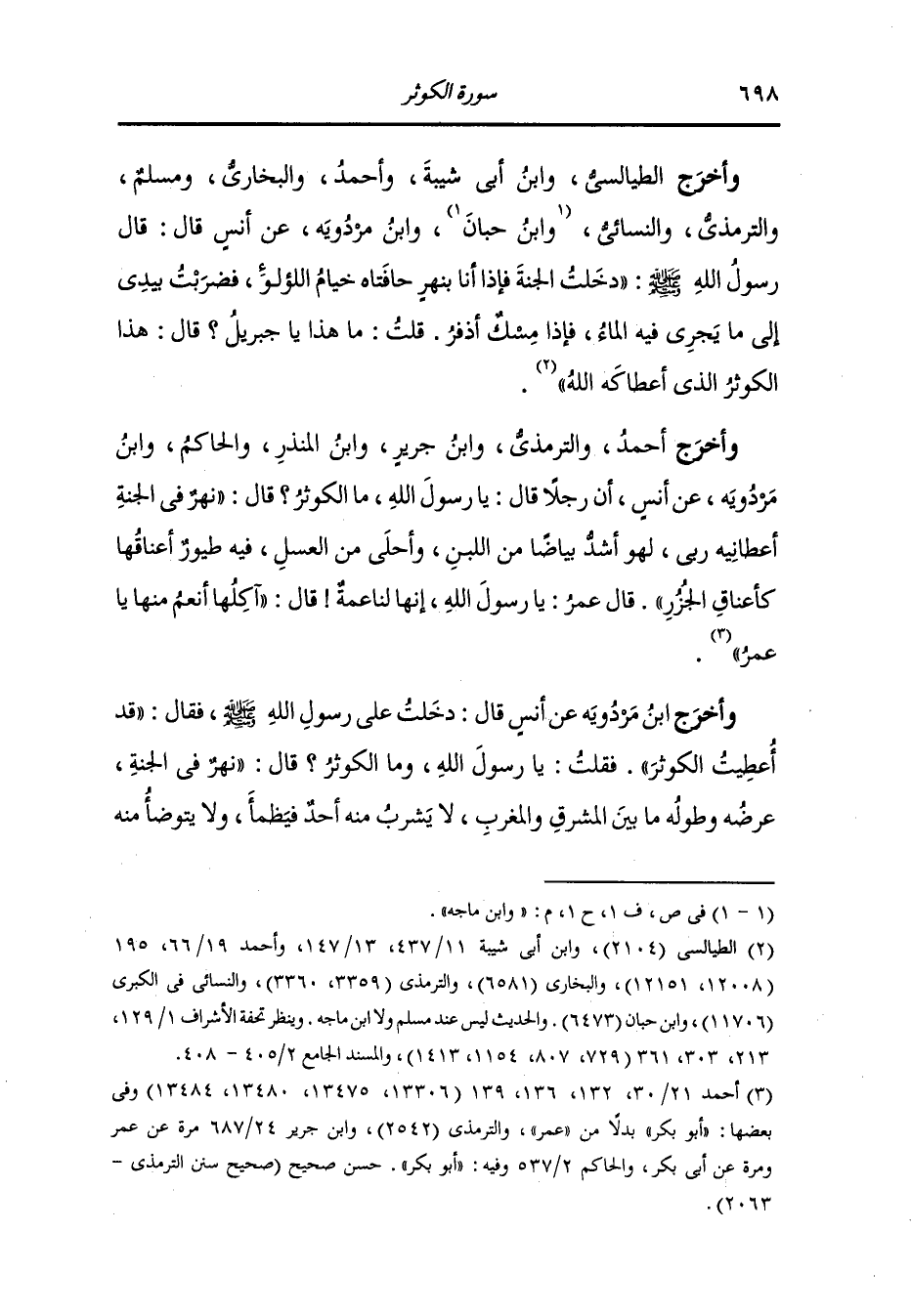 وأخرج ابن أبي شيبة وأحمد والترمذي وصححه ، وَابن ماجة ، وَابن جَرِير ، وَابن المنذر ، وَابن مردويه عن عطاء بن السائب قال : قال لي محارب بن دثار ما قال سعيد بن جبير في الكوثر قلت : حدثنا عن ابن عباس أنه الخير الكثير ، فقال : صدقت والله إنه للخير الكثير ولكن حدثنا ابن عمر قال : نزلت {إنا أعطيناك الكوثر} فقال رسول الله صلى الله عليه وسلم : الكوثر نهر في الجنة حافتاه من ذهب يجري على الدر والياقوت تربته أطيب من المسك وماؤه أشد بياضا من اللبن وأحلى من العسل.