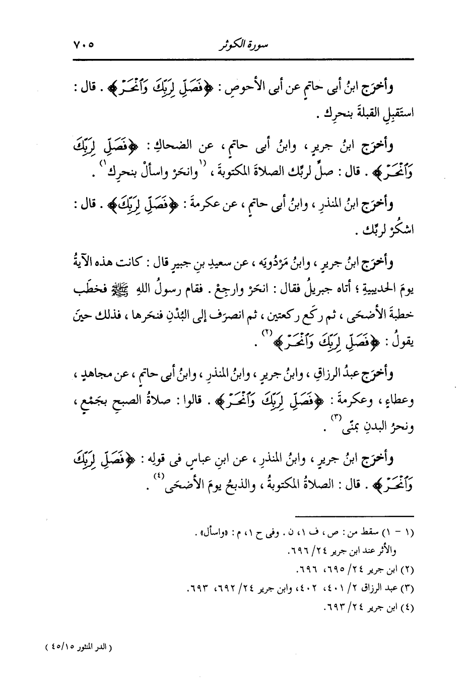 وأخرج ابن جريرعن قتادة {فصل لربك وانحر} قال : صلاة الأضحى والنحر نحر البدن.