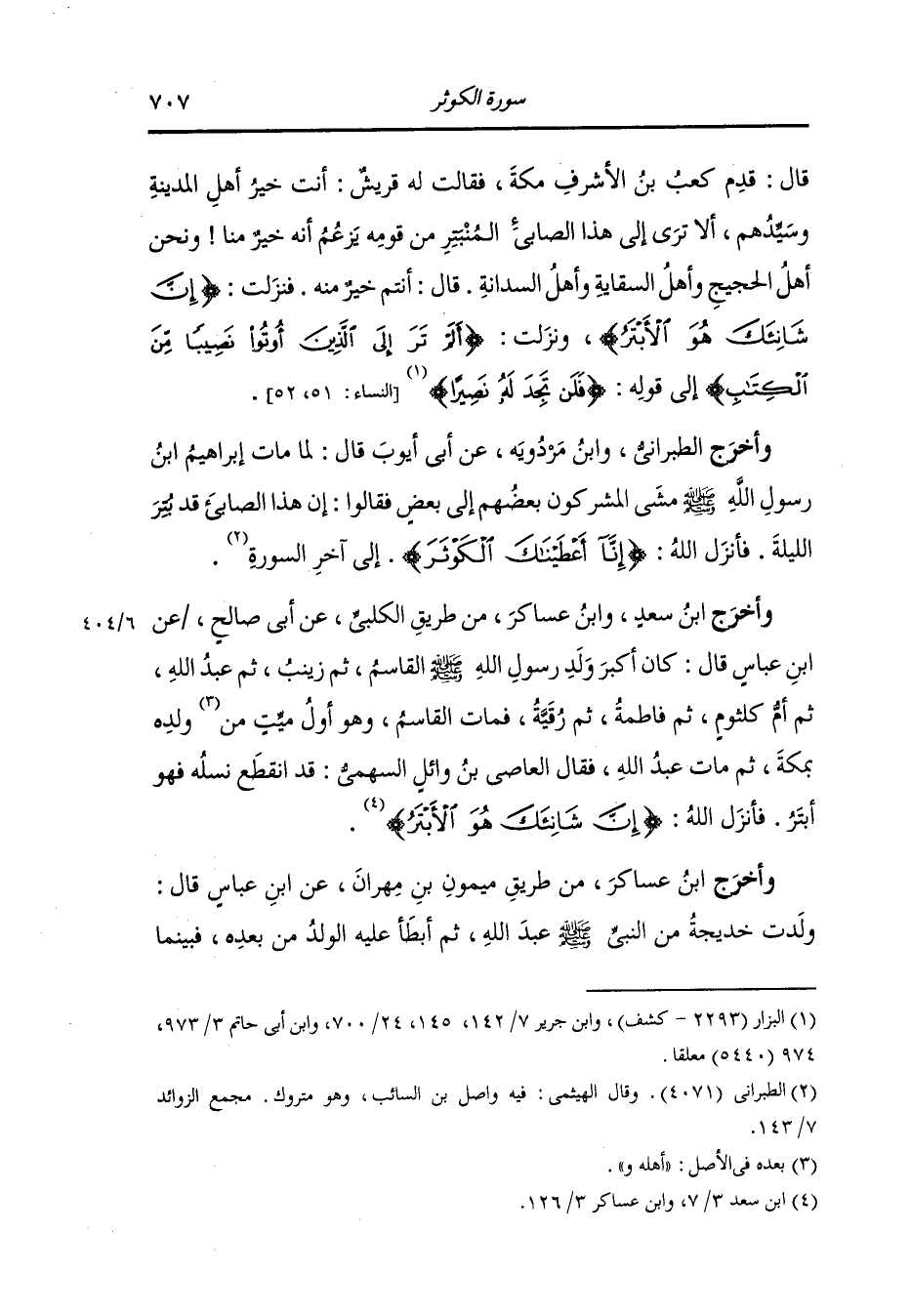 رسول الله صلى الله عليه وسلم يكلم رجلا والعاصي بن وائل ينظر إليه إذ قال له رجل : من هذا قال : هذا الأبتر يعني النَّبِيّ صلى الله عليه وسلم فكانت قريش إذا ولد للرجل ثم أبطأ عليه الولد من بعده قالوا هذا الأبتر فأنزل الله {إن شانئك هو الأبتر} أي مغضك هو الأبتر الذي بتر من كل خير ، وأخر البيهقي في الدلائل عن محمد بن علي قال : كان القاسم ابن رسول الله صلى الله عليه وسلم قد بلغ أن يركب على الدابة ويسير على النجيبة فلما قبضه الله قال عمرو بن العاصي : لقد أصبح محمد أبتر من ابنه فأنزل الله {إنا أعطيناك الكوثر} عوضا يا محمد عن مصيبتك بالقاسم {فصل لربك وانحر إن شانئك هو الأبتر} قال البيهقي : هكذا روي بهذا الإسناد وهو ضعيف والمشهور أنها نزلت في العاصي بن وائل.