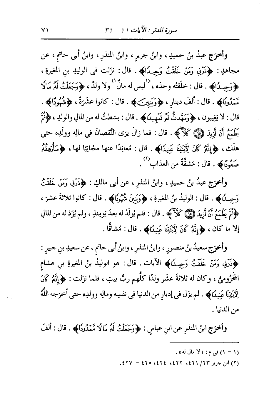 وأخرج عَبد بن حُمَيد ، وَابن المنذر عن أبي مالك {ذرني ومن خلقت وحيدا} قال : الوليد بن المغيرة {وبنين شهودا} قال : كانوا ثلاثة عشر {ثم يطمع أن أزيد كلا} قال : فلم يولد له بعد يومئذ ولم يزدد له من المال إلا ما كان {إنه كان لآياتنا عنيدا} قال : مشاقا.