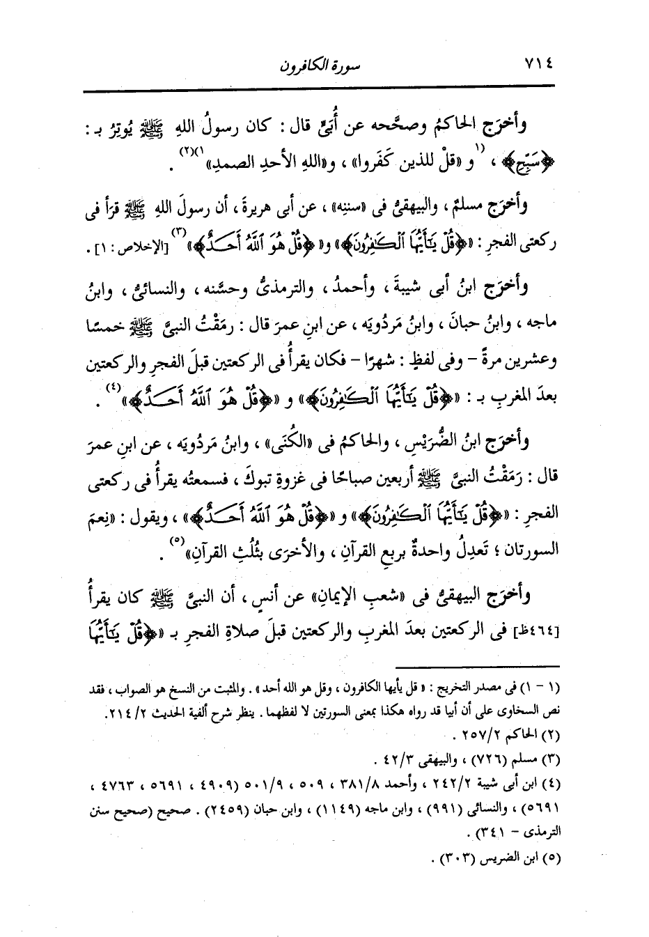 وأخرج محمد بن نصر والطبراني في الأوسط " عن ابن عمر قال :قال رسول الله صلى الله عليه وسلم : (قل هو الله أحد) تعد ثلث القرآن و(قل يأيها الكافرون) تعدل ربع القرآن" . وكان يقرأ بهما في ركعتي الفجر وقال : هاتان الركعتان فيهما رغب الدهر" . (