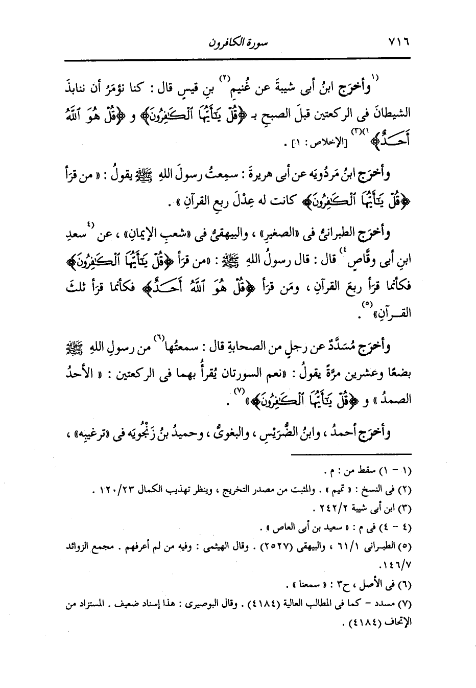 وأخرج سعيد بن منصور ، وَابن أبي شيبة ، وَابن مردويه عن عبد الرحمن بن نوفل الأشجعي عن أبيه قال : قلت يا رسول الله : إني حديث عهد بشرك فمرني بآية تبرئني من الشرك فقال : اقرأ {قل يا أيها الكافرون} قال : فما أخطأها أبي من ويم ولا ليلة حتى فارق الدنيا.