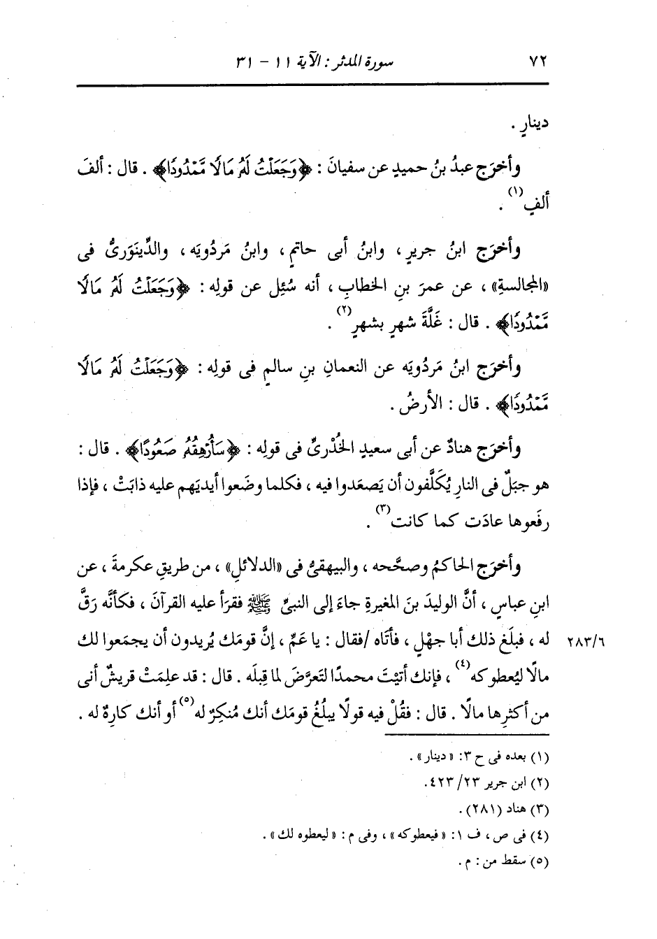 وأخرج عَبد بن حُمَيد عن سفيان {وجعلت له مالا ممدودا} قال : ألف ألف
