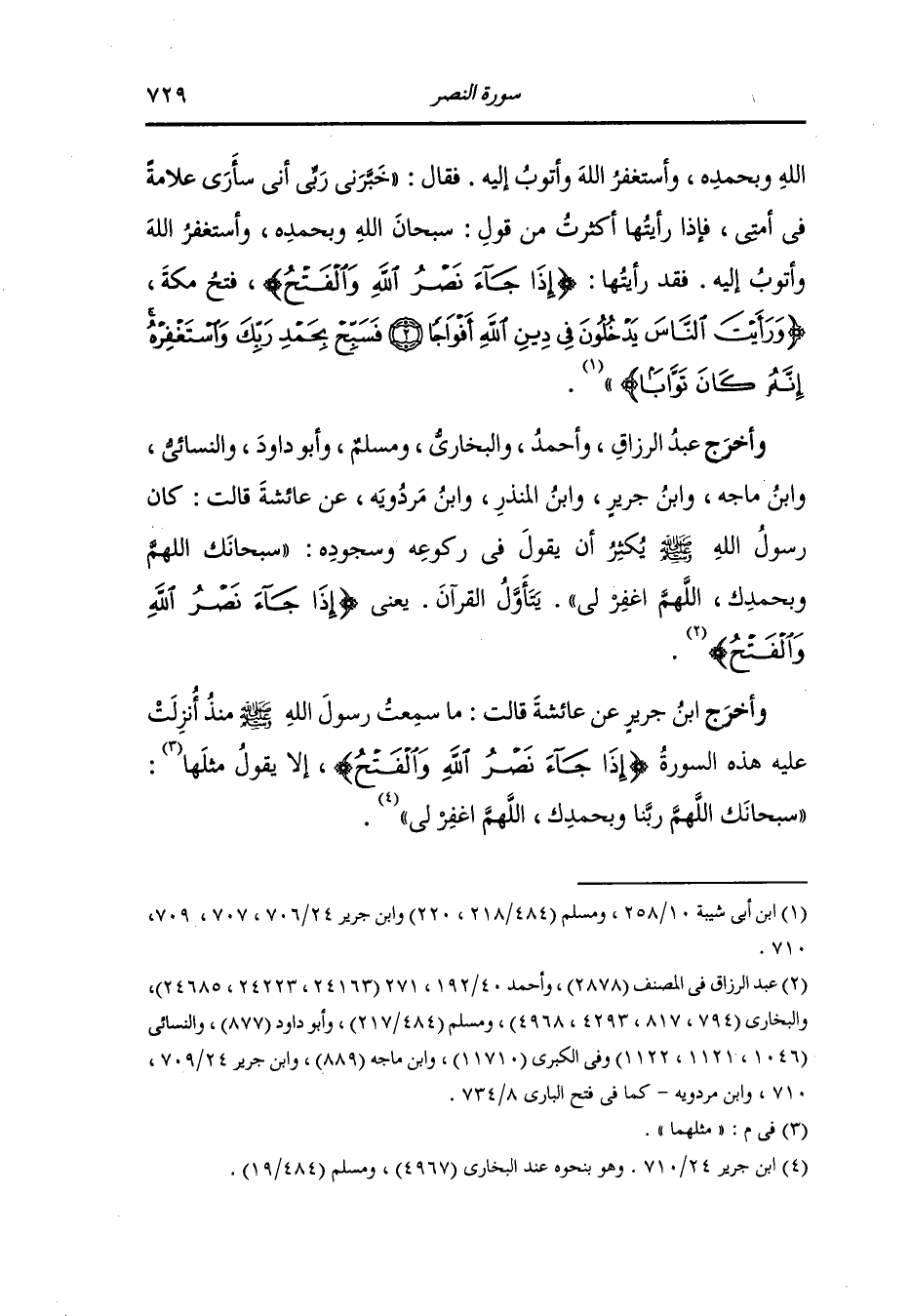 وأخرج عبد الرزاق ومحمد بن نصر ، وَابن جَرِير ، وَابن المنذر ، وَابن مردويه عن ابن مسعود قال : لما نزلت {إذا جاء نصر الله والفتح} كان النَّبِيّ صلى الله عليه وسلم يكثر أن يقول : سبحانك اللهم وبحمدك اغفر لي إنك أنت التواب الغفور.