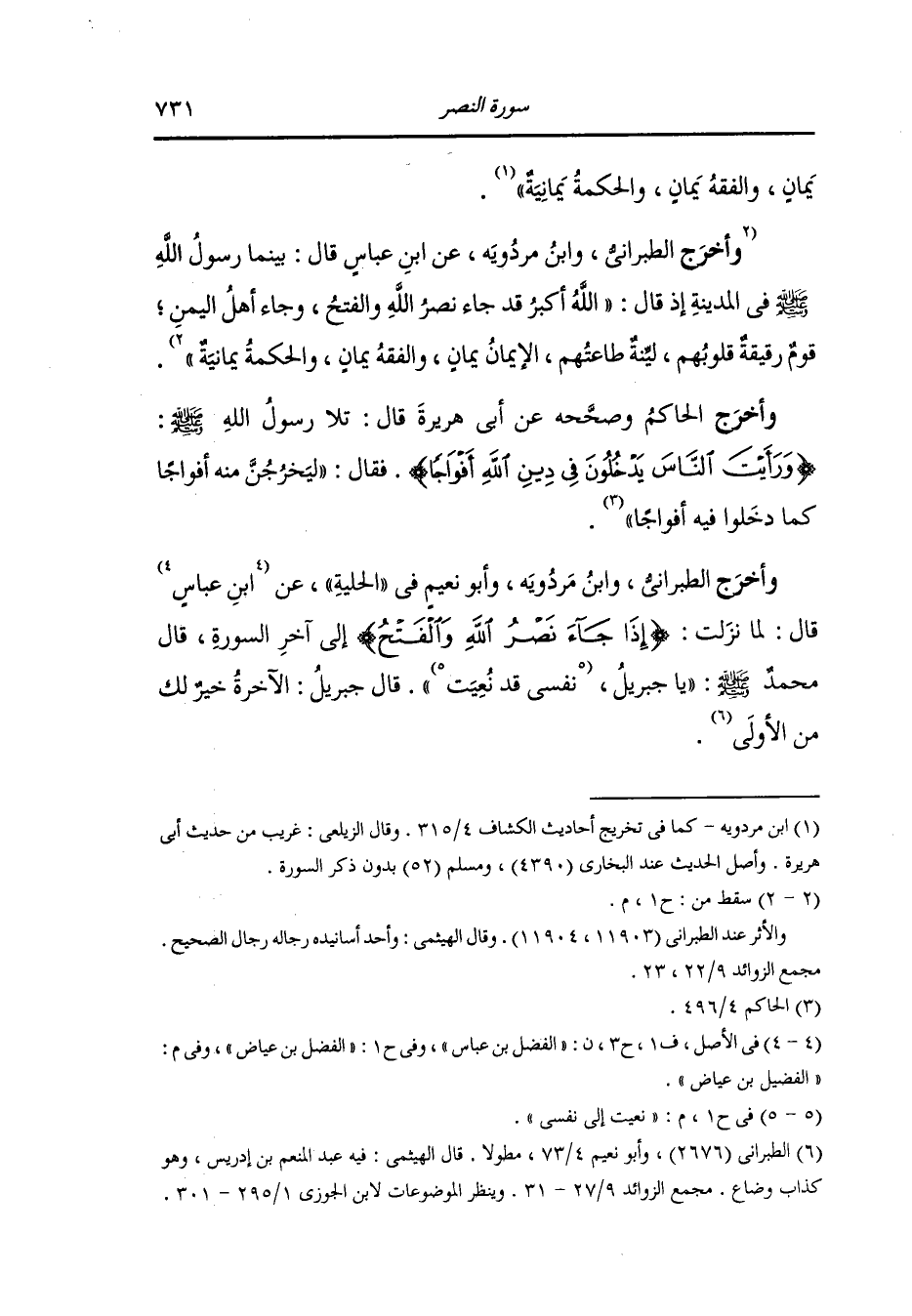 وأخرج ابن عساكر عن ابن عباس إن رسول الله صلى الله عليه وسلم قال : {إذا جاء نصر الله والفتح} وجاء أهل اليمن رقيقة أفئدتهم وطباعهم سجية قلوبهم عظيمة حسنتهم دخلوا في دين الله أفواجا.