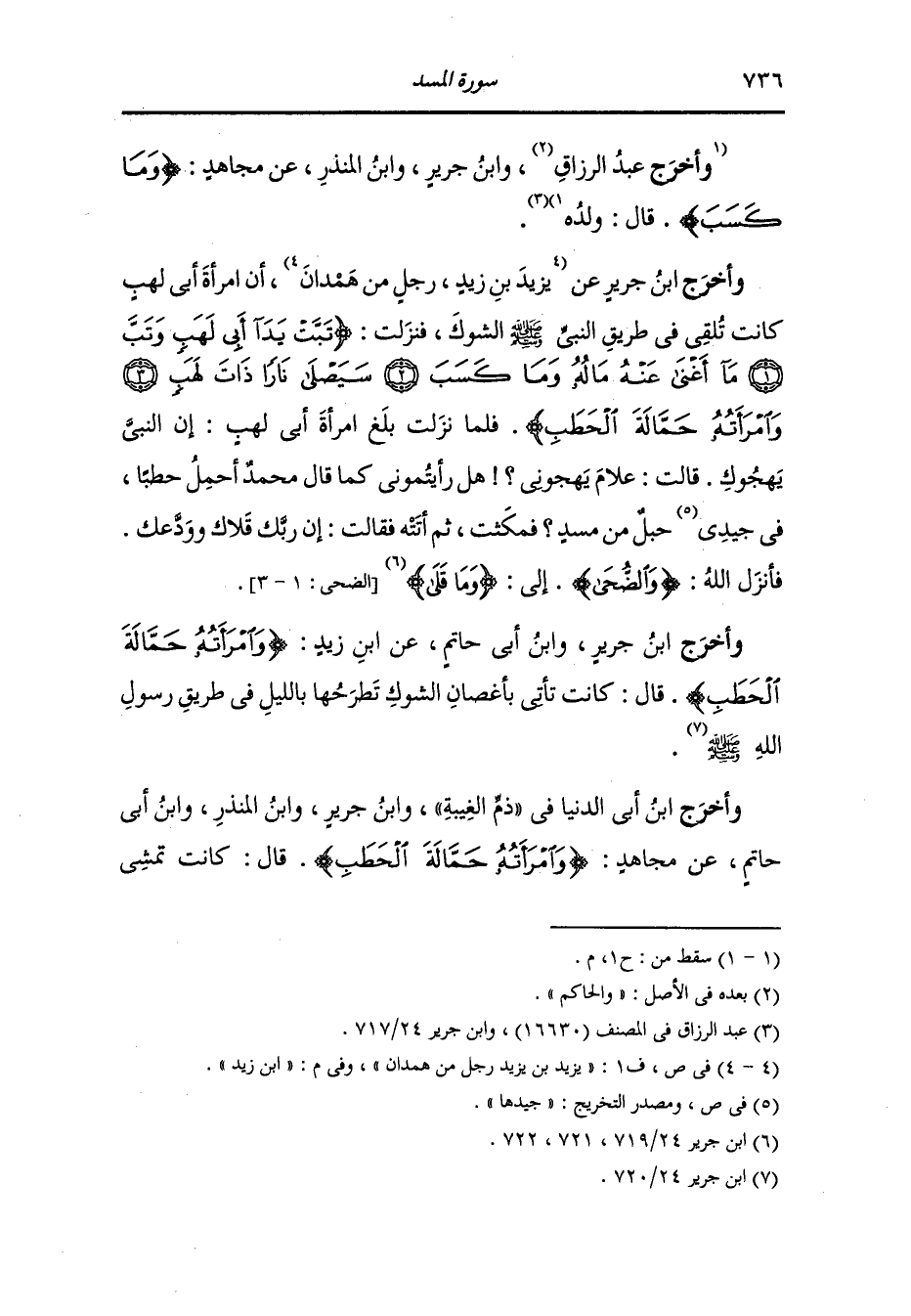 وأخرج ابن جرير ، وَابن أبي حاتم عن قتادة {وامرأته حمالة الحطب} قال : كانت تنقل الأحاديث من بعض الناس إلى بعض {في جيدها حبل} قال : عنقها.