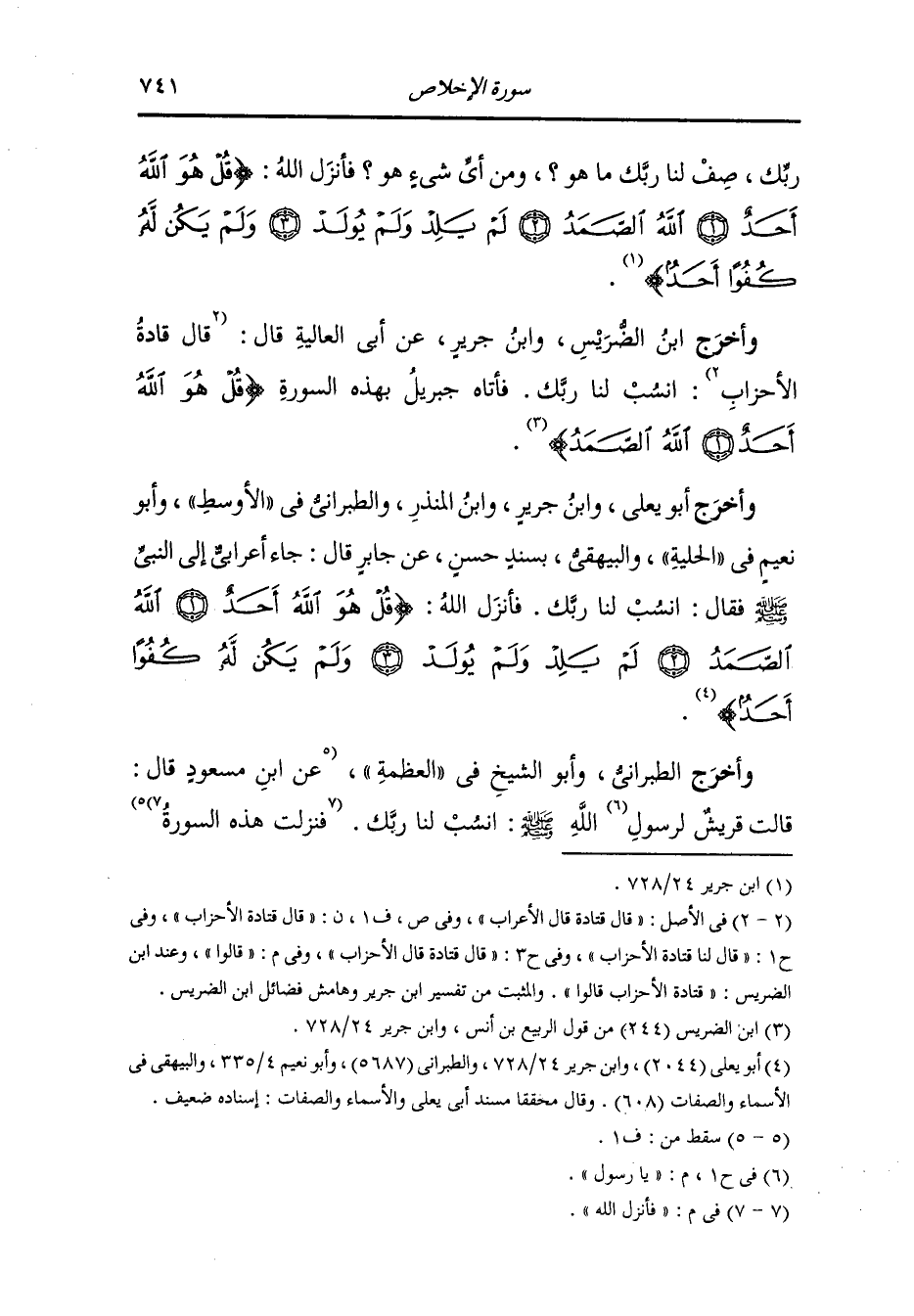 وأخرج أبو الشيخ في العظمة وأبو بكر السمرقندي في فضائل {قل هو الله أحد} عن أنس رضي الله عنه قال : جاءت يهود خيبر إلى النَّبِيّ صلى الله عليه وسلم فقالوا : يا أبا القاسم خلق الله الملائكة من نور الحجاب وآدم من حمأ مسنون وإبليس من لهب النار والسماء من دخان والأرض من زبد الماء فأخبرنا عن ربك فلم يجبهم النَّبِيّ صلى الله عليه وسلم فأتاه جبريل بهذه السورة {قل هو الله أحد} ليس له عروق تتشعب {الله الصمد} ليس بالأجوف لا يأكل ولا يشرب {لم يلد ولم يولد} ليس له والد ولا ولد ينسب إليه {ولم يكن له كفوا أحد} ليس من خلقه شيء يعدل مكانه يمسك السموات إن زالتا هذه السورة ليس فيها ذكر جنة ولا نار ولا دنيا ولا آخرة ولا حلال ولا حرام انتسب الله إليها فهي له خالصة من قرأها ثلاث مرات عدل بقراءة الوحي كله ومن قرأها ثلاثين مرة لم يفضله أحد من أهل الدنيا يومئذ إلا من زاد على ما قال ومن قرأها مائتي مرة أسكن من الفودوس سكنا يرضاه ومن قرأها حين يدخل منزله ثلاث مرات نفت عن الفقر ونفعت