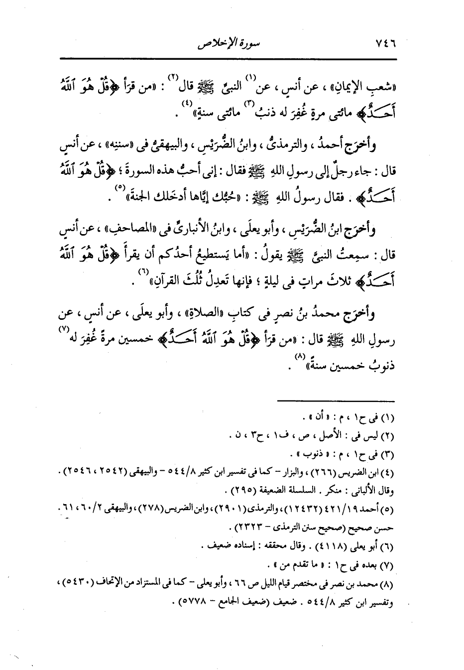 وأخرج الترمذي وأبو يعلى ومحمد بن نصر ، وَابن عدي والبيهقي في الشعب واللفظ له عن أنس رضي الله عنه قال : قال رسول الله صلى الله عليه وسلم : من قرأ كل يوم مائتي مرة {قل هو الله أحد} كتب الله له ألفا وخمسمائة حسنة ومحا عنه ذنوب خمسين سنة إلا أن يكون عليه دين.