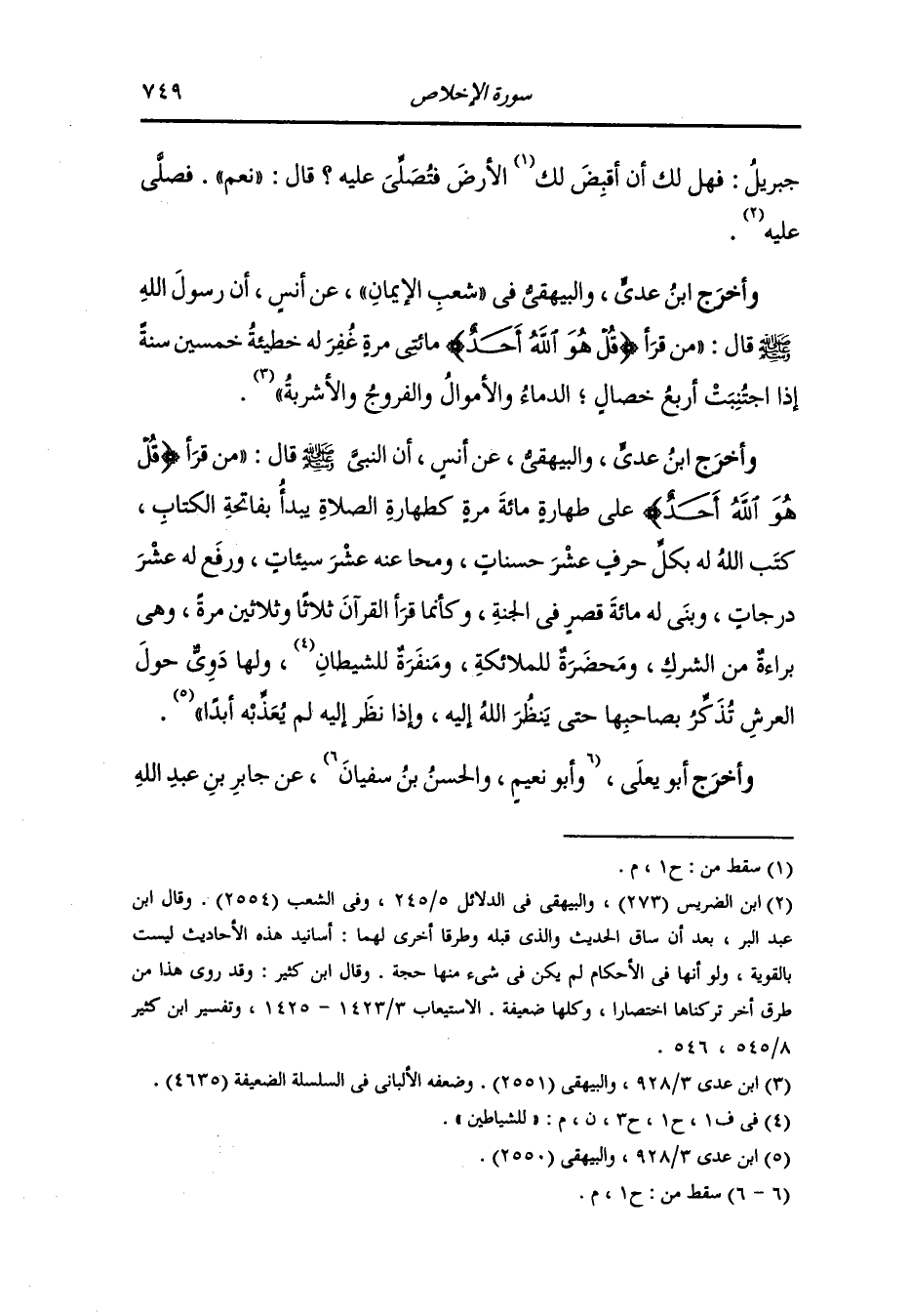 وأخرج الطبراني في الأوسط بسند فيه مجهول ، عَن جَابر بن عبد الله قال : قال رسول الله صلى الله عليه وسلم : من قرأ {قل هو الله أحد} في كل يوم خمسين مرة نودي يوم القيامة من قبره : قم مادح الله فأدخل الجنة.