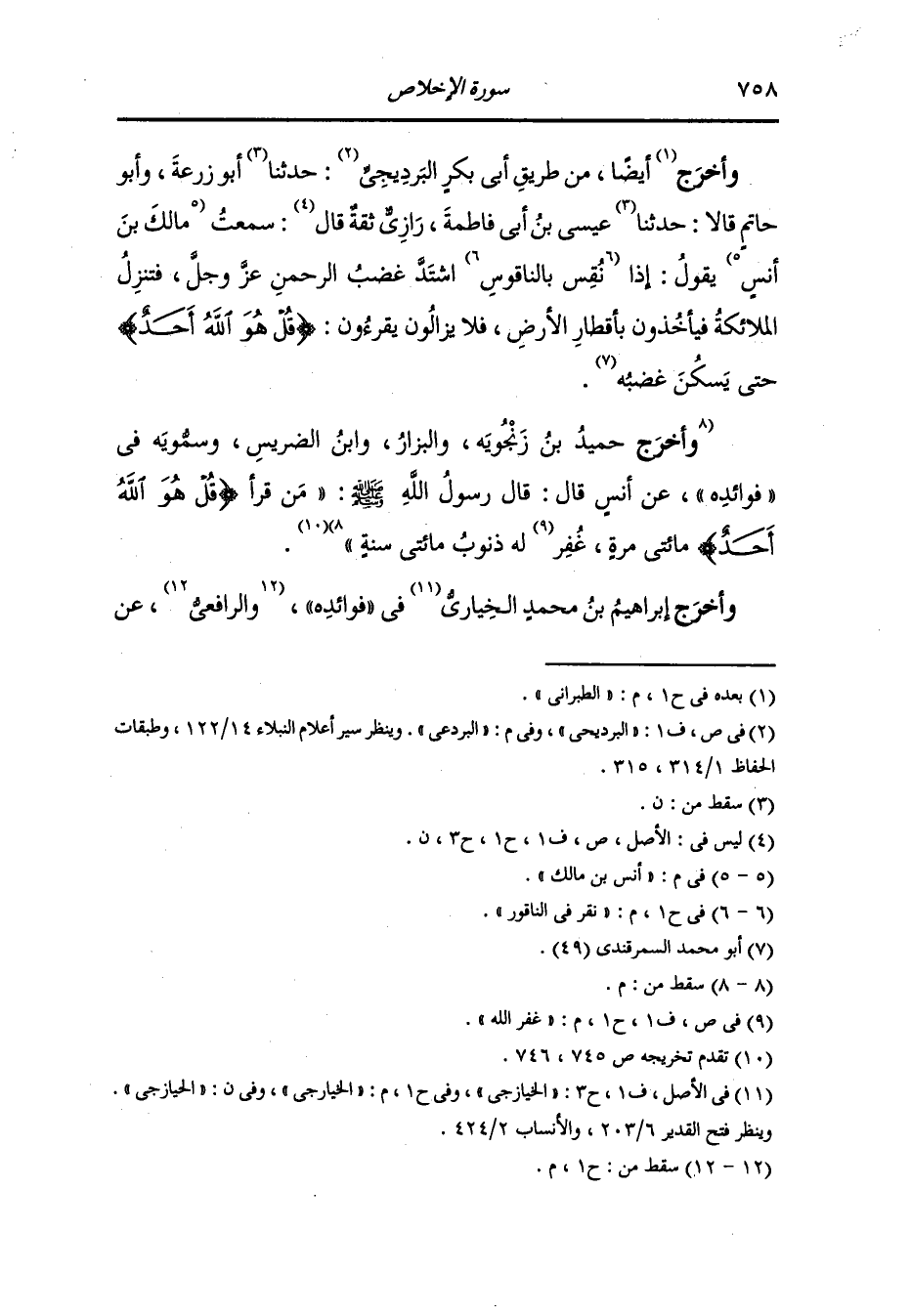 وأخرج البخاري ومسلم والنسائي والبيهقي في الأسماء والصفات عن عائشة أن النَّبِيّ صلى الله عليه وسلم بعث رجلا على سرية فكان يقرأ لأصحابه في صلاتهم فيختم : ب {قل هو الله أحد} فلما رجعوا ذكروا ذلك لرسول الله صلى الله عليه وسلم فقال : سلوه لأي شيء يصنع ذلك فسألوه فقال : لأنها صفة الرحمن فأنا أحب أن أقرأها.