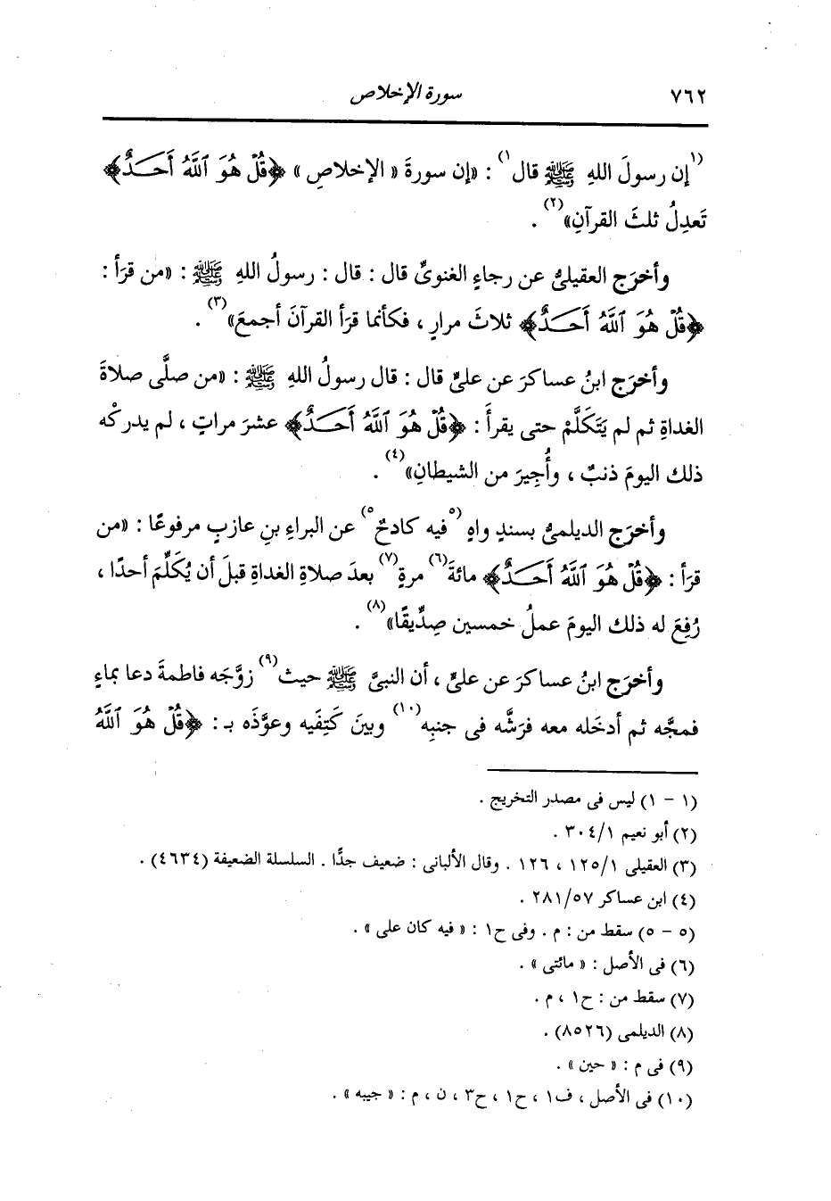 وأخرج البيهقي في الشعب عن ابن عباس قال : من صلى ركعتين فقرأ فيهما {قل هو الله أحد} ثلاثين مرة بنى الله له ألف قصر من ذهب في الجنة ومن قرأها في غير صلاة بنى الله له مائة قصر في الجنة ومن قرأها في صلاة كان أفضل من ذلك ومن قرأها إذا دخل إلى أهله أصاب أهله وجيرانه منها خير.