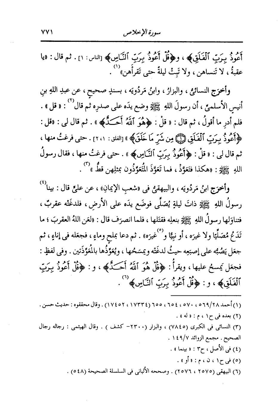 وَأخرَج الحاكم وصححه والبيهقي في "شعب الايمان" عن أبي هريرة ان رسول الله صلى الله عليه وسلم قال : لا ينامن أحدكم حتى يقرأ ثلث القرآن" قالوا:يارسول الله وكيف يستطيع أحدنا أن يقرأ ثلث القرآن؟ قال:"ألا يستطيع أن يقرأ ب (قل هو الله أحد) و(قل أعوذ برب الفلق) و(قل أعوذ برب الناس)..