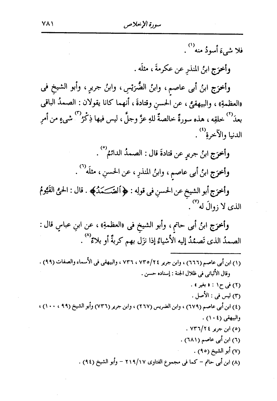 وأخرج ابن عاصم ، وَابن أبي حاتم عن إبراهيم قال: الصمد الذي تصمد إليه العباد في حوائجهم.