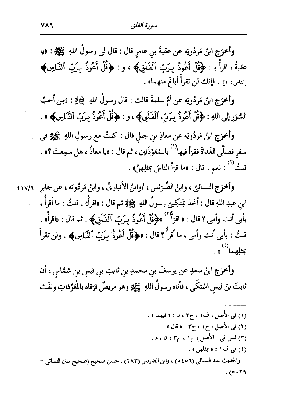 وأخرج الحاكم عن عقبة بن عامر قال : كنت أقود برسول الله صلى الله عليه وسلم راحلته في السفر فقال : يا عقبة ألا أعلمك خير سورتين قرئتهما قلت : بلى ، قال : {قل أعوذ برب الفلق} و(قل أعوذ برب الناس) فلما نزل صلى بهما صلاة الغداة ثم قال له : كيف ترى يا عقبة.