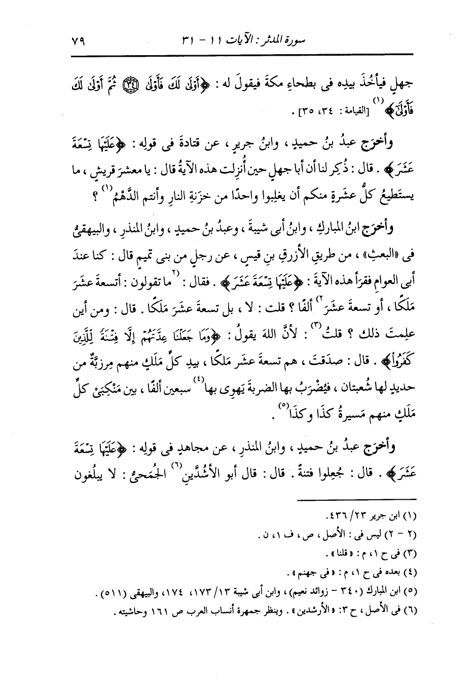 وأخرج ابن المبارك ، وَابن أبي شيبة ، وعَبد بن حُمَيد ، وَابن المنذر والبيهقي في البعث من طريق الأزرق بن قيس عن رجل من بني تميم قال : كنا عند أبي العوام فقرأ هذه الآية {عليها تسعة عشر} فقال : ما تقولون أتسعة عشر ملكا أو تسعة عشر ألفا قلت : لا بل تسعة عشر ملكا فقال : ومن أين علمت ذلك قلنا : لأن الله يقول : {وما جعلنا عدتهم إلا فتنة للذين كفروا} قال : صدقت هم تسعة عشر ملكا بيد كل ملك منهم مرزبة من حديد له شعبتان فيضرب بها الضربة يهوي بها في جهنم سبعين ألفا بين منكبي كل ملك منهم مسيرة كذا وكذا.