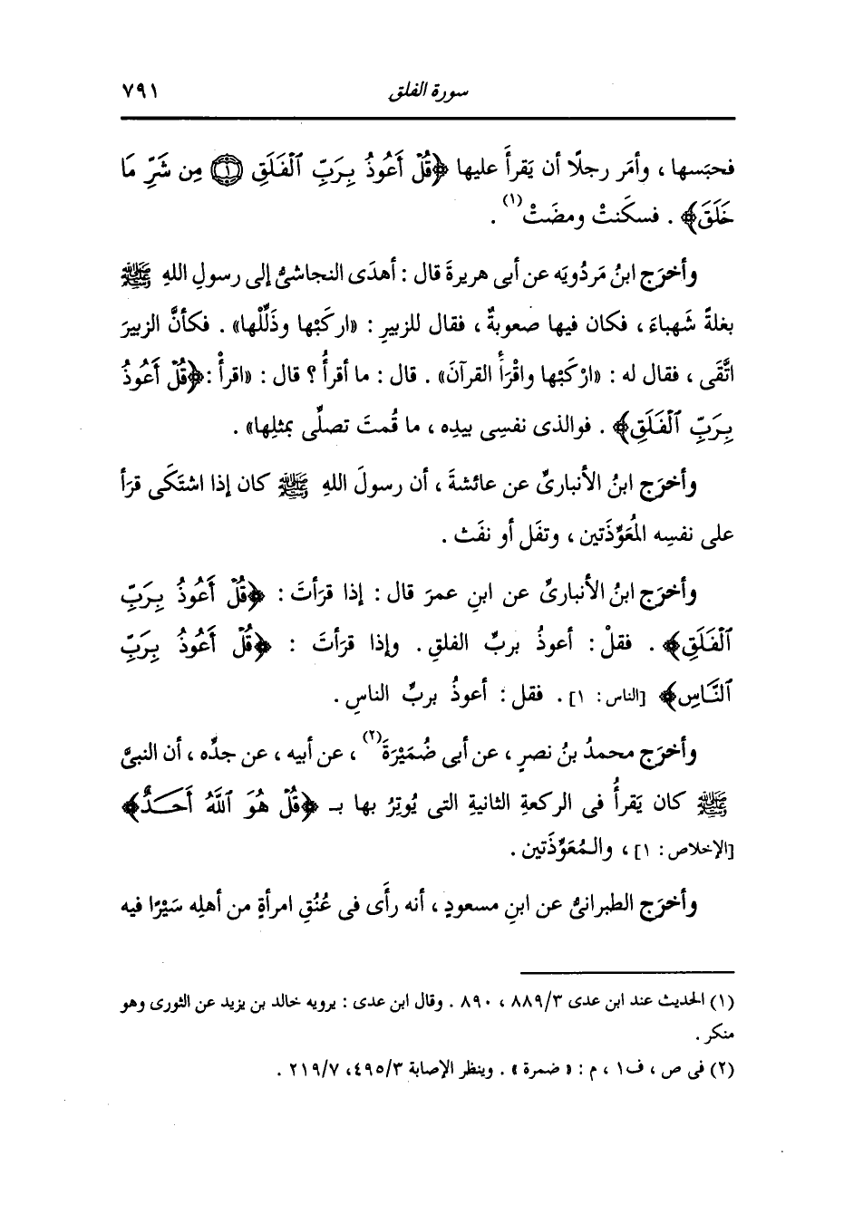 وأخرج عَبد بن حُمَيد في مسنده عن زيد بن أسلم قال : سحر النَّبِيّ صلى الله عليه وسلم رجل من اليهود فاشتكى فأتاه جبريل فنزل عليه بالمعوذتين وقال : إن رجلا من اليهود سحرك والسحر في بئر فلان فأرسل عليا فجاء به فأمره أن