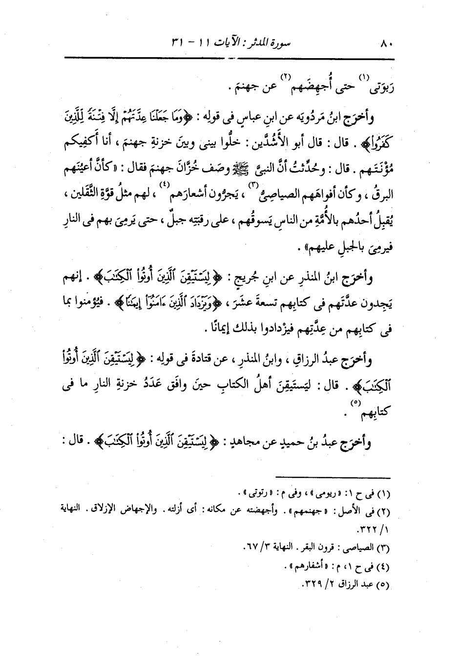 وأخرج عبد الرزاق ، وَابن المنذر عن قتادة في قوله : {ليستيقن الذين أوتوا الكتاب} قال : يستيقن أهل الكتاب حين وافق عدد خزنة النار ما في كتابهم.