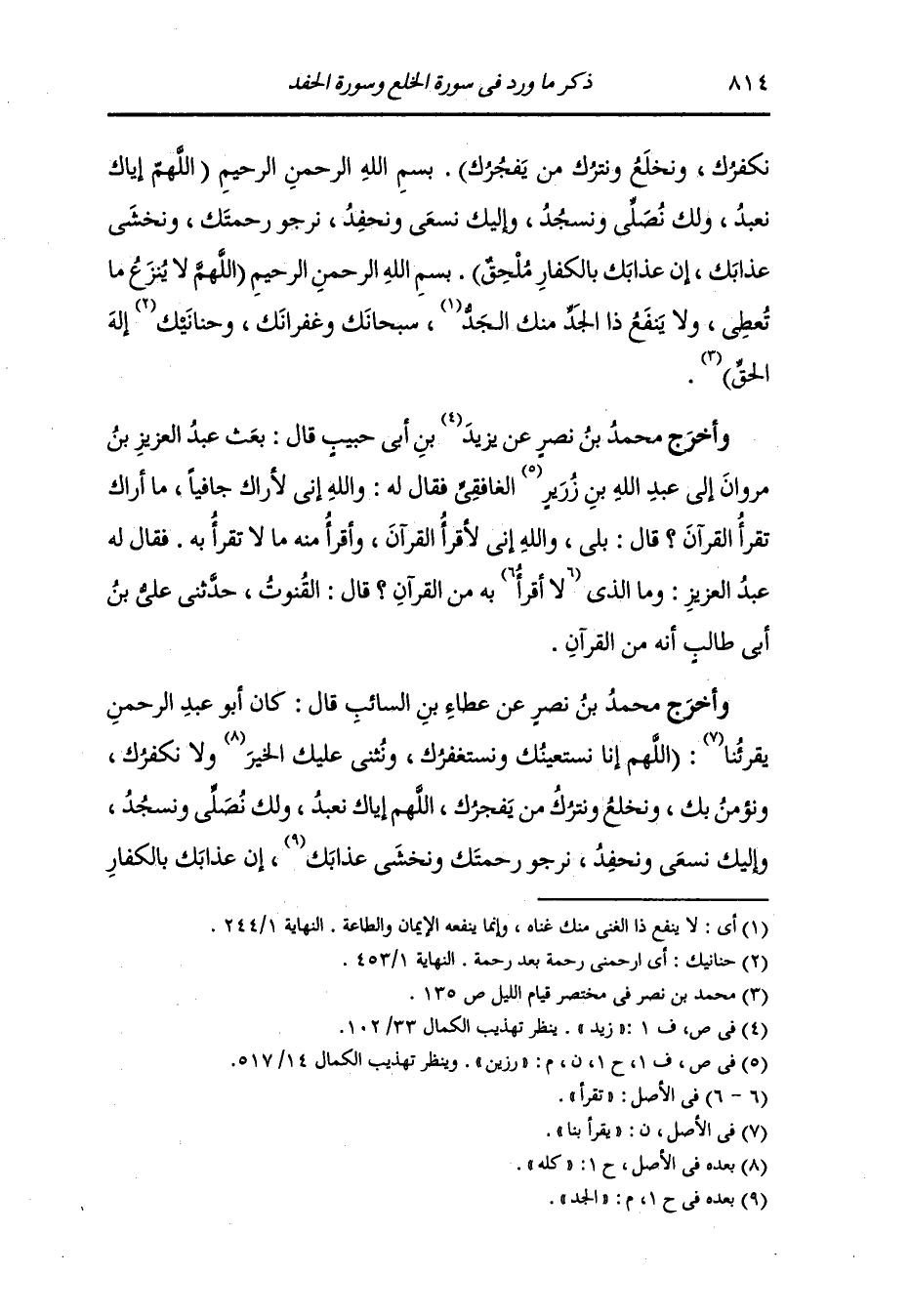 وأخرج محمد بن نصر عن خصيف قال : سألت عطاء بن أبي رباح أي شيء أقول في القنوت قال : هاتين السورتين اللتين في قراءة أبي : اللهم إنا نستعينك واللهم إياك نعبد.