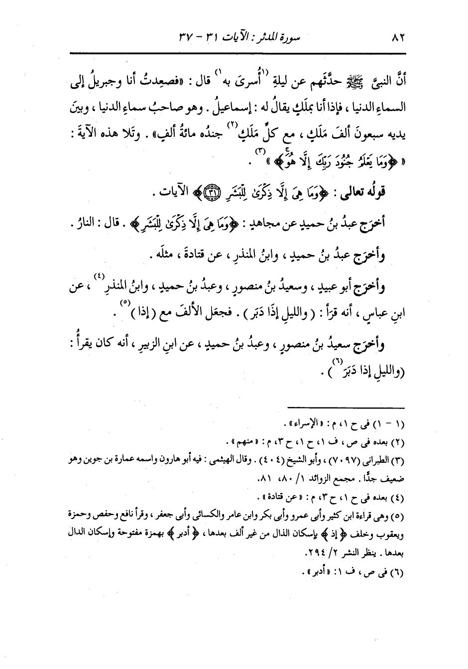 أن رسول الله صلى الله عليه وسلم حدثهم عن ليلة الإسراء قال : فصعدت أنا وجبريل إلى السماء الدنيا فإذا أنا بملك يقال له إسماعيل وهو صاحب سماء الدنيا وبين يديه سبعون ألف ملك مع كل ملك منهم جنده مائة ألف وتلا هذه الآية {وما يعلم جنود ربك إلا هو}.
