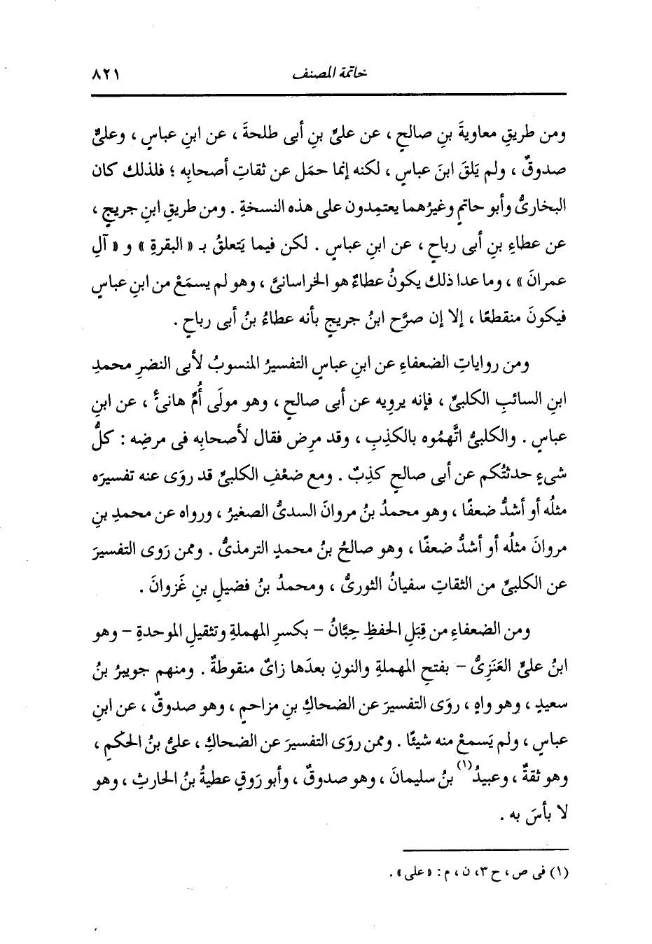 ومنهم عثمان بن عطاء الخراساني رضي الله عنه يروي التفسير عن أبيه عن ابن عباس ، ولم يسمع أبوه من ابن عباس ، ومنهم إسماعيل بن عبدالرحمن السدي بضم المهملة وتشديد الدال وهو كوفي صدوق ولكنه جمع التفسير من طرق منها عن أبي صالح عن ابن عباس وعن مرة بن شراحيل عن ابن مسعود وعن ناس من الصحابة رضي الله عنهم وغيرهم وخلط روايات الجميع فلم تتميز روايات الثقة من الضعيف ، ولم يلق السدي من الصحابة إلا أنس بن مالك وربما التبس بالسدي الصغير الذي تقدم ذكره ، ومنهم إبراهيم بن الحكم بن أبان العدني وهو ضعيف يروي التفسير عن أبيه عن عكرمة وإنما ضعفوه لأنه وصل كثيرا من الأحاديث بذكر ابن عباس وقد روى عنه تفسيره عَبد بن حُمَيد ، ومنهم إسماعيل بن أبي زياد الشامي وهو ضعيف جمع تفسيرا كثيرا فيه الصحيح والسقيم وهو في عصر أتباع التابعين ، ومنهم عطاء بن دينار رضي الله عنه وفي [ وفيه ] لين يروي التفسير عن سعيد بن جبير عن ابن عباس رضي الله عنهما تفسير رواه عنه ابن لهيعة وهو ضعيف ، ومن تفاسير التابعين ما يروى عن قتادة رضي الله عنه وهو من طرق منها رواية