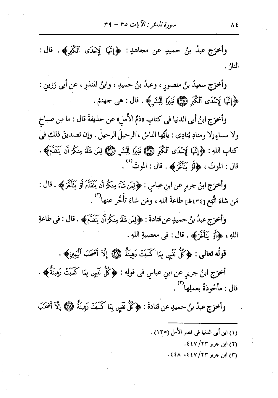وأخرج عَبد بن حُمَيد عن قتادة {لمن شاء منكم أن يتقدم} قال : في طاعة الله {أو يتأخر} قال : في معصية الله.