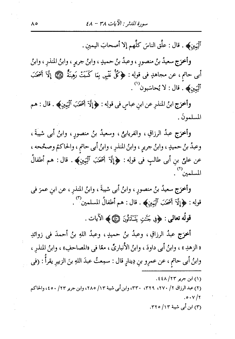 وأخرج ابن المنذر عن ابن عباس في قوله : {إلا أصحاب اليمين} قال : هم المسلمون.