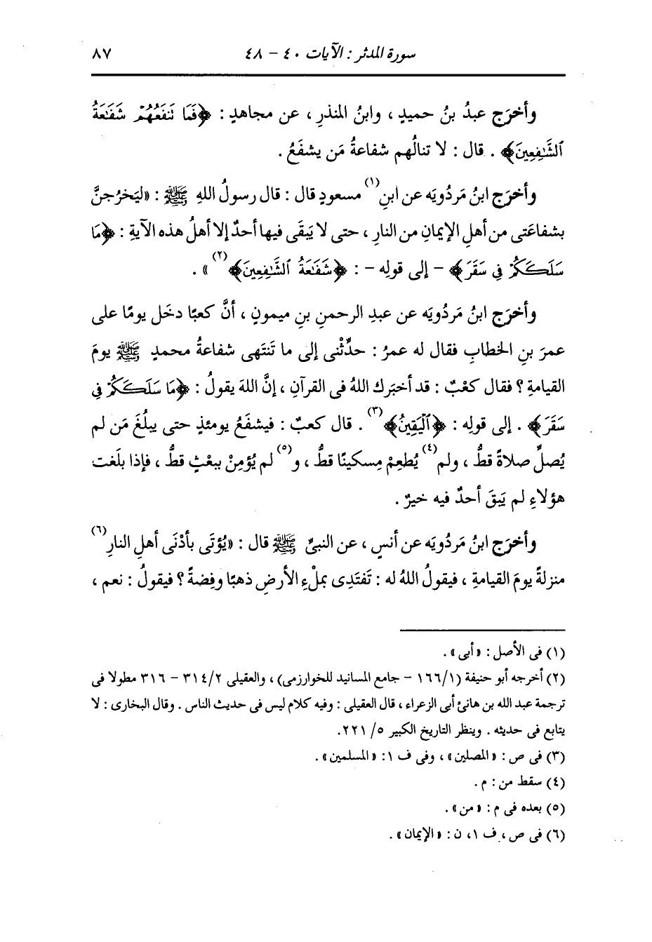وأخرج ابن مردويه عن عبد الرحمن بن ميمون أن كعبا دخل يوما على عمر بن الخطاب فقال له عمر : حدثني إلى ما تنتهي شفاعة محمد يوم القيامة فقال كعب : قد أخبرك الله في القرآن إن الله يقول : {ما سلككم في سقر} إلى قوله : {اليقين} قال كعب : فيشفع يومئذ حتى يبلغ من لم يصل صلاة قط ويطعم مسكينا قط ومن لم يؤمن ببعث قط فإذا بلغت هؤلاء لم يبق أحد فيه خير.
