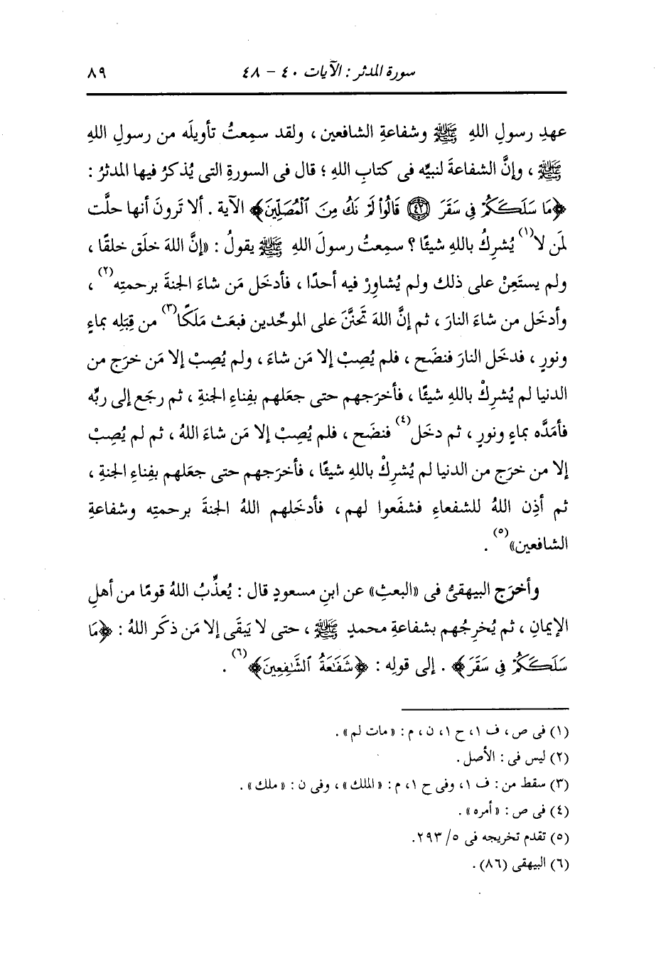 عهد رسول الله صلى الله عليه وسلم وشفاعة الشافعين ولقد سمعت تأويله من رسول الله صلى الله عليه وسلم وإن الشفاعة لنبيه في كتاب الله قال في السورة التي تذكر فيها المدثر : {ما سلككم في سقر قالوا لم نك من المصلين} الآية ألا ترون أنها حلت لمن مات لم يشرك بالله شيئا سمعت رسول الله صلى الله عليه وسلم يقول : إن الله خلق خلقا ولم ستعن على ذلك ولم يشاور فيه أحدا فأدخل من شاء الجنة برحمته وأدخل من شاء النار ثم إن الله تحنن على الموحدين فبعث الملك من قبله بماء ونور فدخل النار فنضح فلما يصب إلا من شاء ولم يصب إلا من خرج من الدنيا لم يشرك بالله شيئا فأخرجهم حتى جعلهم بفناء الجنة ثم رجع إلى ربه فأمده بماء ونور ثم دخل فنضح فلم يصب إلا من شاء الله ثم لم يصب إلا من خرج من الدنيا لم يشرك بالله شيئا فأخرجهم حتى جعلهم بفناء الجنة ثم أذن الله للشفعاء فشفعوا لهم فأدخلهم الله الجنة برحته وشفاعة الشافعين.