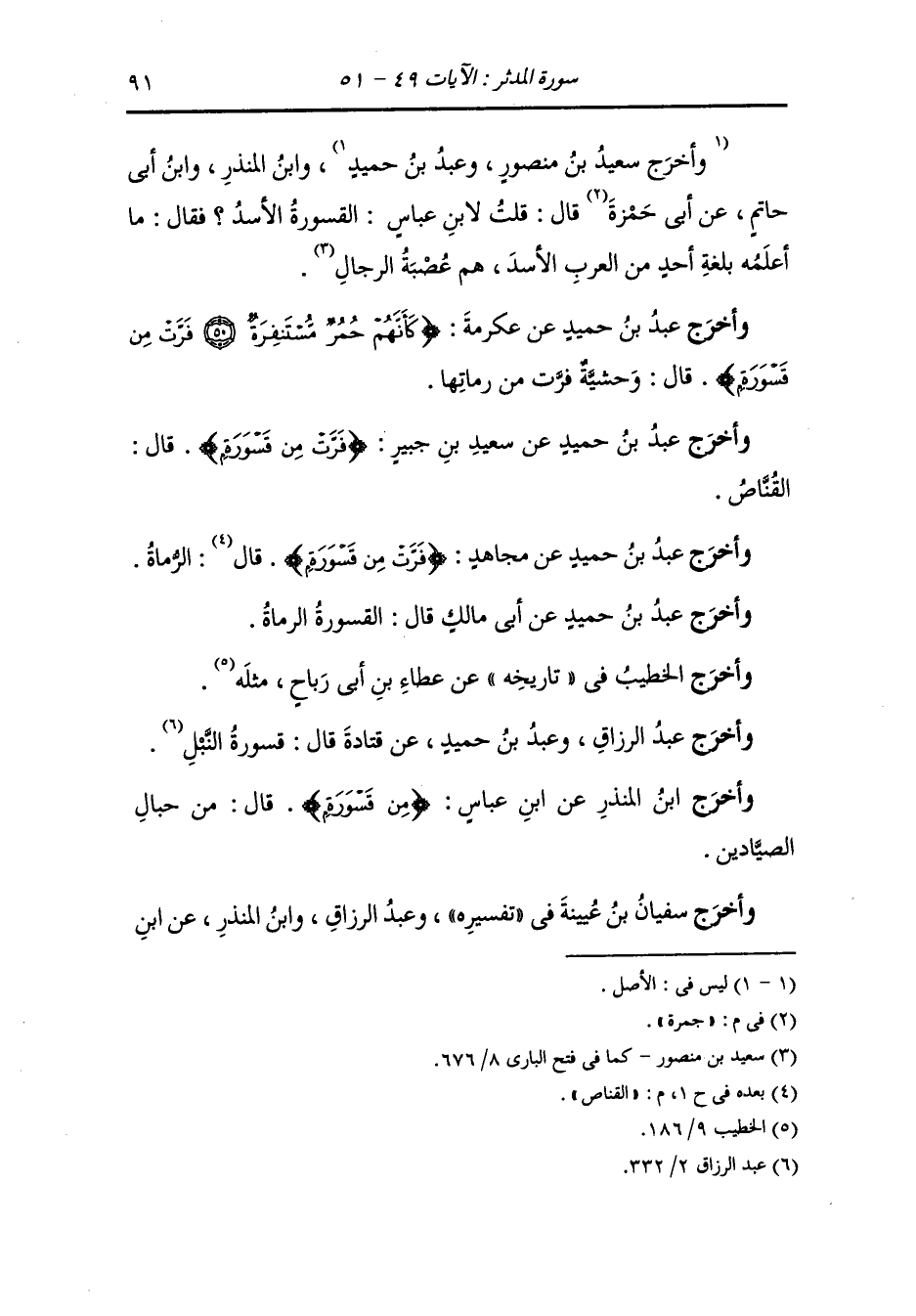 وأخرج عَبد بن حُمَيد عن سعيد بن جبير {فرت من قسورة} قال : القناص ، واخرج عَبد بن حُمَيد عن مجاهد {فرت من قسورة} قال : القناص الرماة.