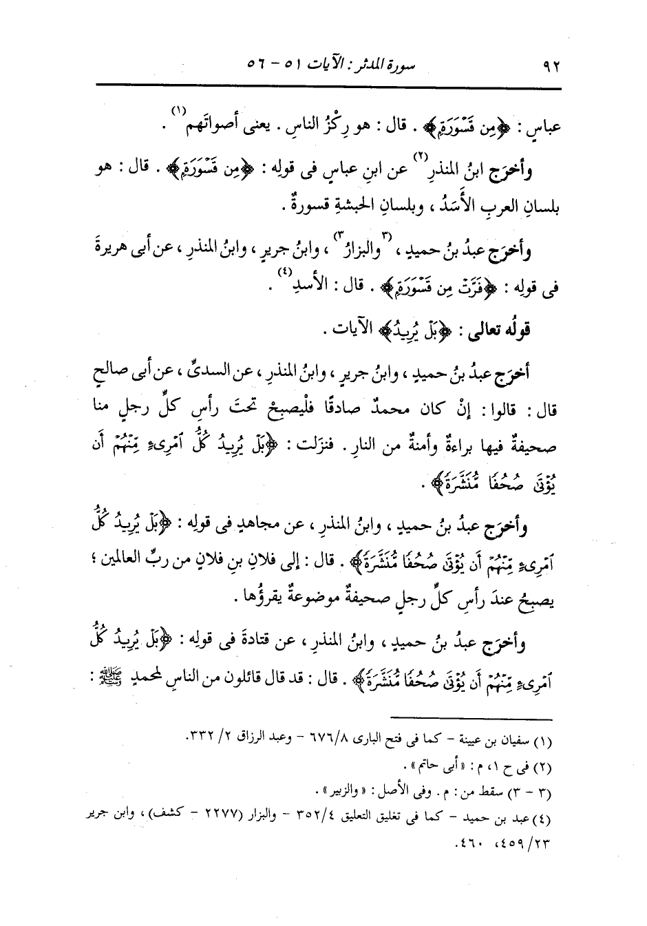 وأخرج عَبد بن حُمَيد ، وَابن المنذر عن مجاهد رضي الله عنه {بل يريد كل امرئ منهم أن يؤتى صحفا منشرة} قال : إلى فلان بن فلان من رب العالمين يصبح عند رأس كل رجل صحيفة موضوعة يقرؤها.