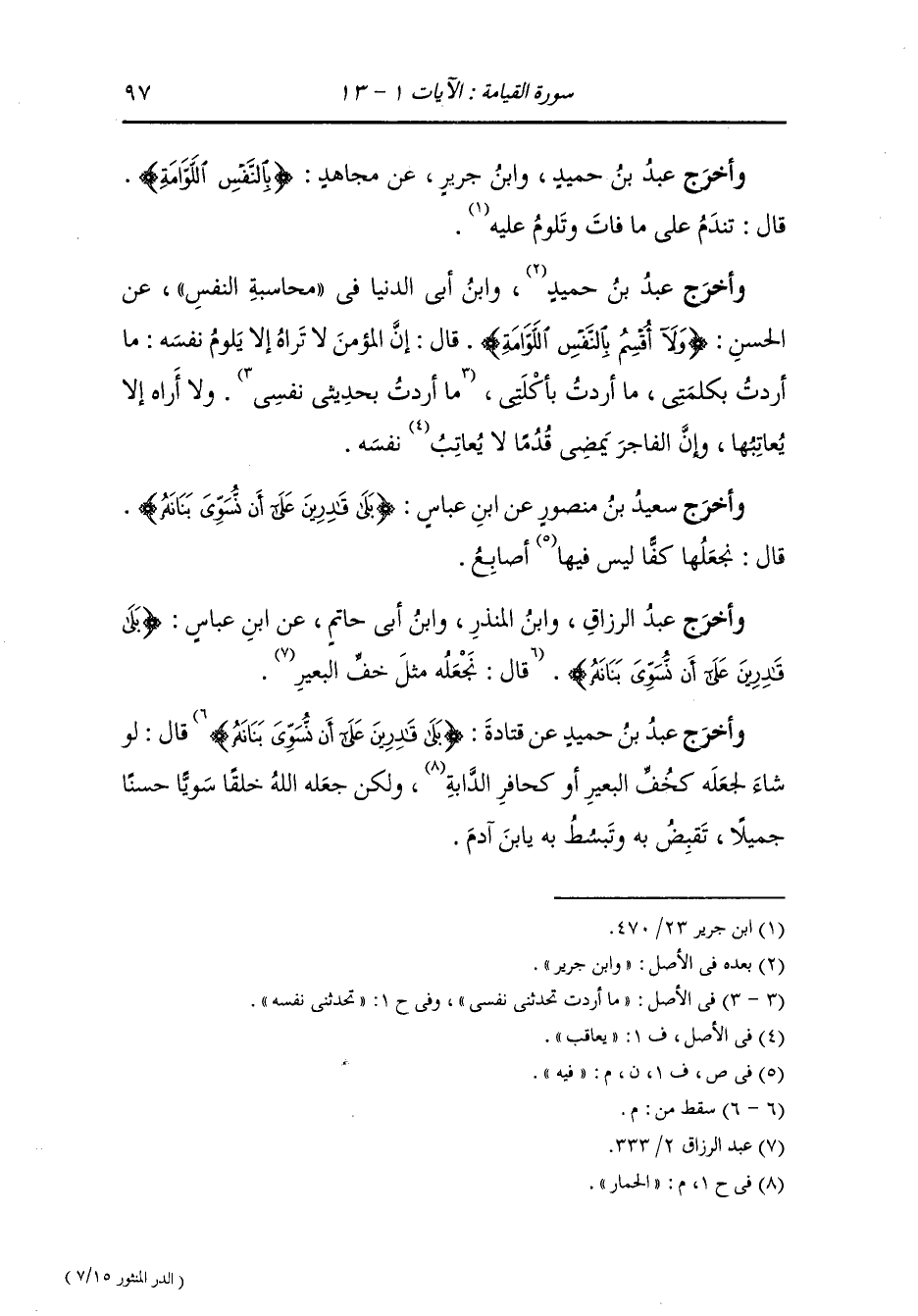 وأخرج عَبد بن حُمَيد ، وَابن أبي الدنيا في محاسبة النفس عن الحسن {ولا أقسم بالنفس اللوامة} قال : إن المؤمن لا تراه إلا يلوم نفسه ما أردت بكلمتي ما أردت بأكلتي ما أردت بحديثي نفسي ولا أراه إلا يعاتبها وإن الفاجر يمضي قدما لا يعاتب نفسه.