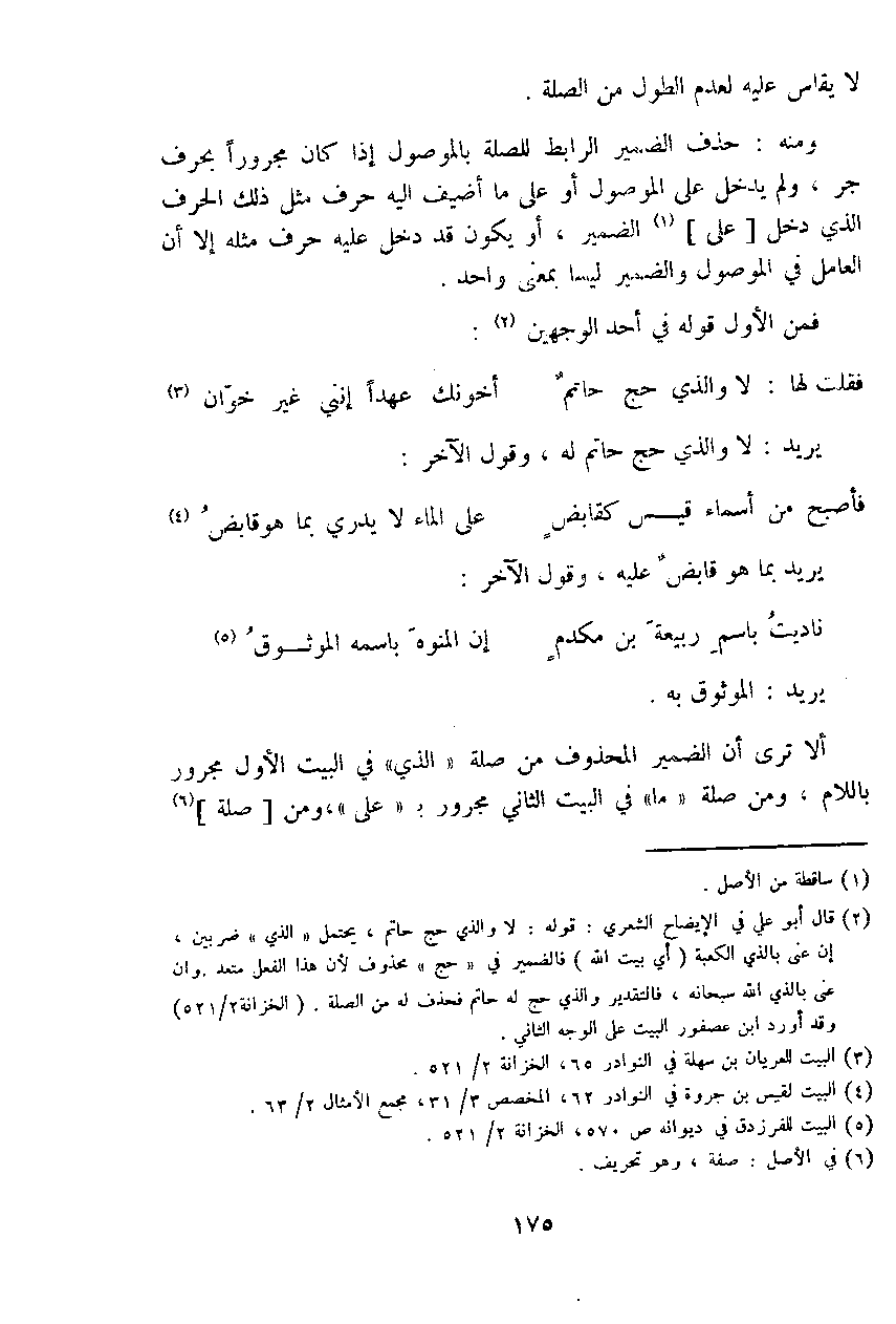 ألا ترى أن الضمير المحذوف من صلة (الذي) في البيت الأول مجرور باللام، ومن صلة (ما) في البيت الثاني مجرور بـ (على)، ومن (صلة)