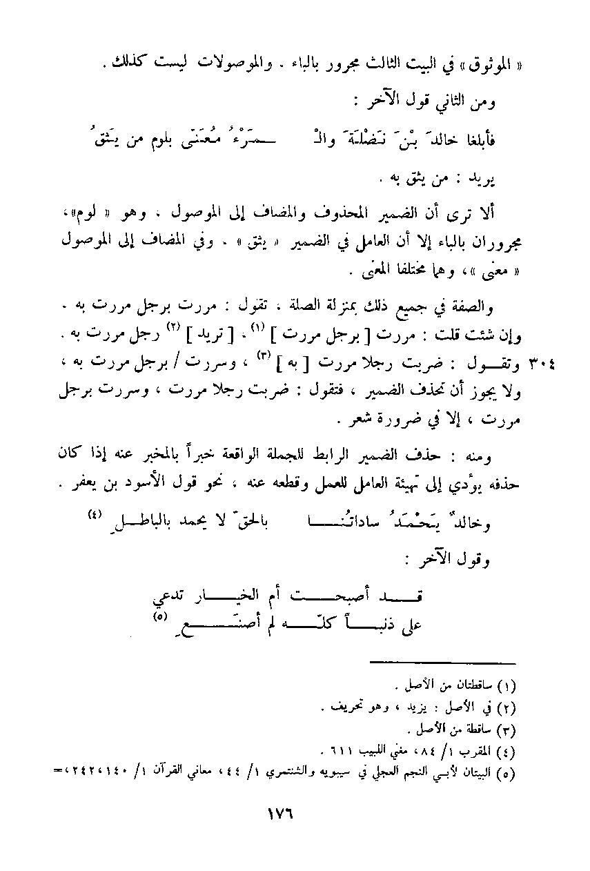 والصفة في جميع ذلك بمنزلة الصلة، تقول: مررت برجل مررت به، وإن شئت قلت: مررت (برجل مررت)، (تريد) رجل مررت به. وتقول: ضربت رجلاً مررت (به)، وسررت برجل مررت به، ولا يجوز أن تحذف الضمير، فتقول: ضربت رجلاً مررت، وسررت برجل مررت، إلا في ضرورة شعر.