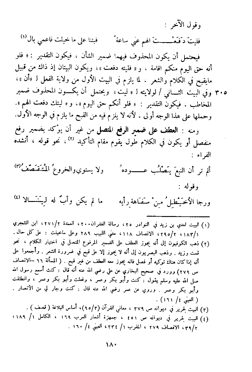 فيحتمل أن يكون المحذوف فيهما ضمير الشأن، فيكون التقدير: (فلو أنه حق اليوم منكم إقامة، و (فليته دفعت)، ويكون البيتان إذ ذاك من قبيل ما يقبح في الكلام والشعر، لما يلزم في البيت الأول من ولاية الفعل لـ (أن)، وفي البيت الثاني لولايته لـ (ليت) ويحتمل أن يكون المحذوف ضمير المخاطب، فيكون التقدير: (فلو أنكر حق اليوم)، و (ليتك دفعت الهم). وحملها على الوجه أولى، لأنه لا يلزم فيه من القبح ما يلزم في الوجه الأول.