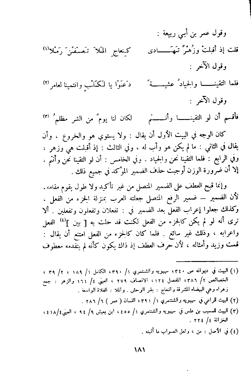 وإنما قبح العطف على الضمير المتصل من غير تأكيد ولا طول يقوم مقامه، لأن الضمير - ضمير الرفع المتصل جعلته العرب بمنزلة الجزء من الفعل، وكذلك جعلوا إعراب الفعل بعد الضمير في: تفعلان وتفعلون وتفعلين. ألا ترى أنه لو لم يكن كالجزء من الفعل لكنت قد حلت به (بين) الفعل وإعرابه، وذلك غير سائغ. فلما كان كالجزء من الفعل امتنع أن يقال: قمت وزيد وأمثاله، لأن حرف العطف إذ ذاك يكون كأنه لم يتقدمه معطوف
